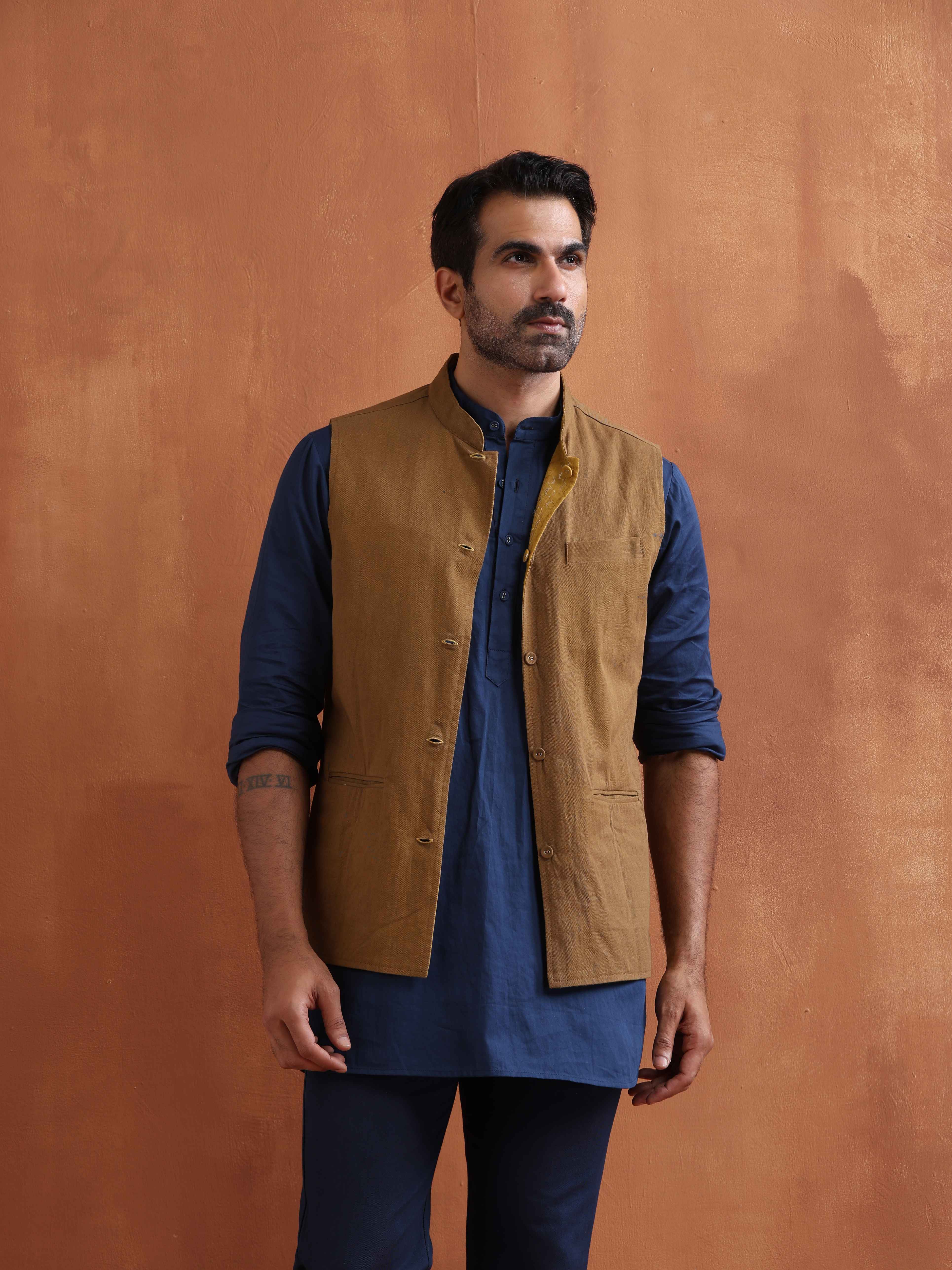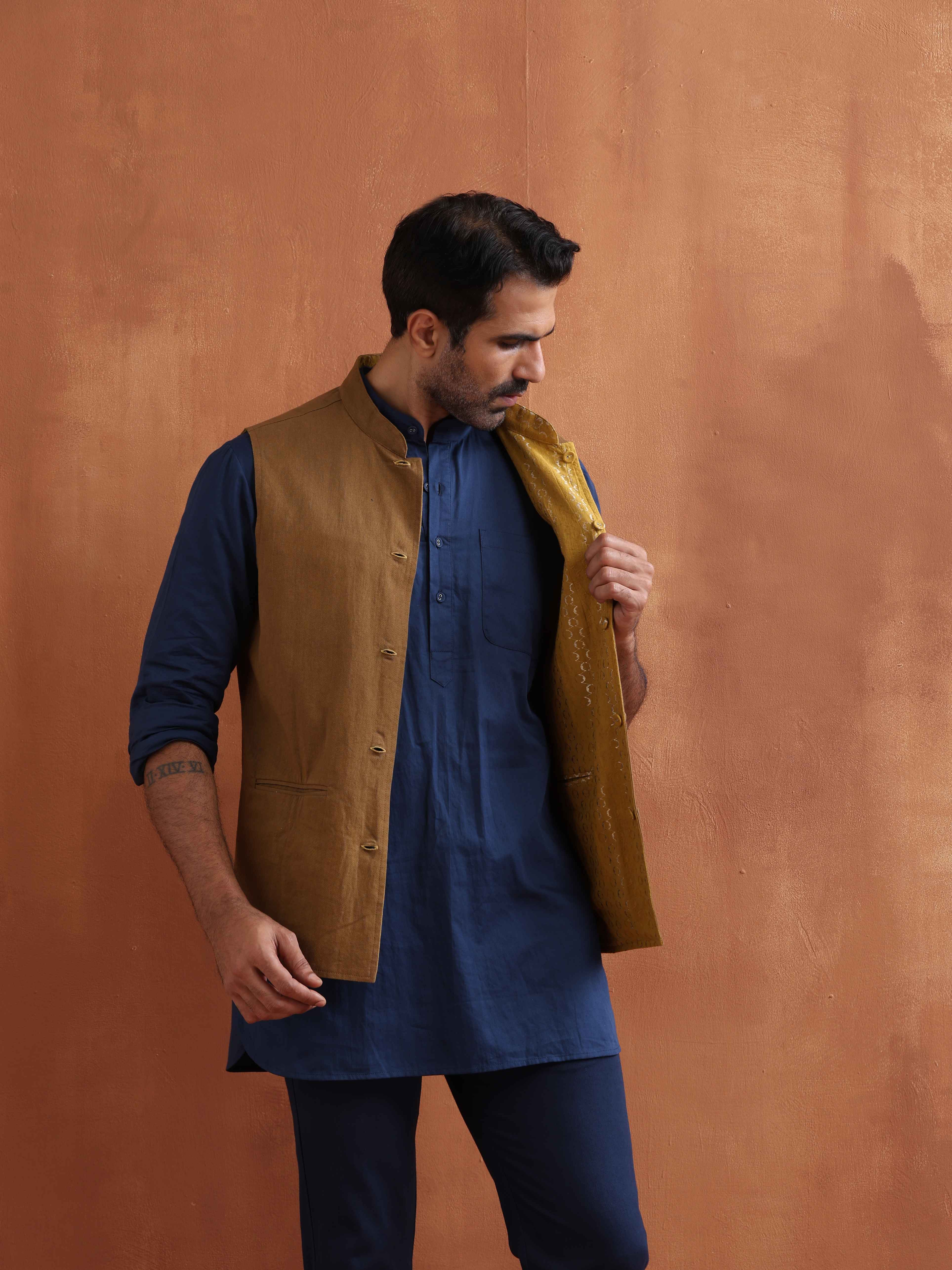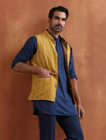 trueBrowns Men's Mustard Cotton Dobby Reversible Nehru Jacket