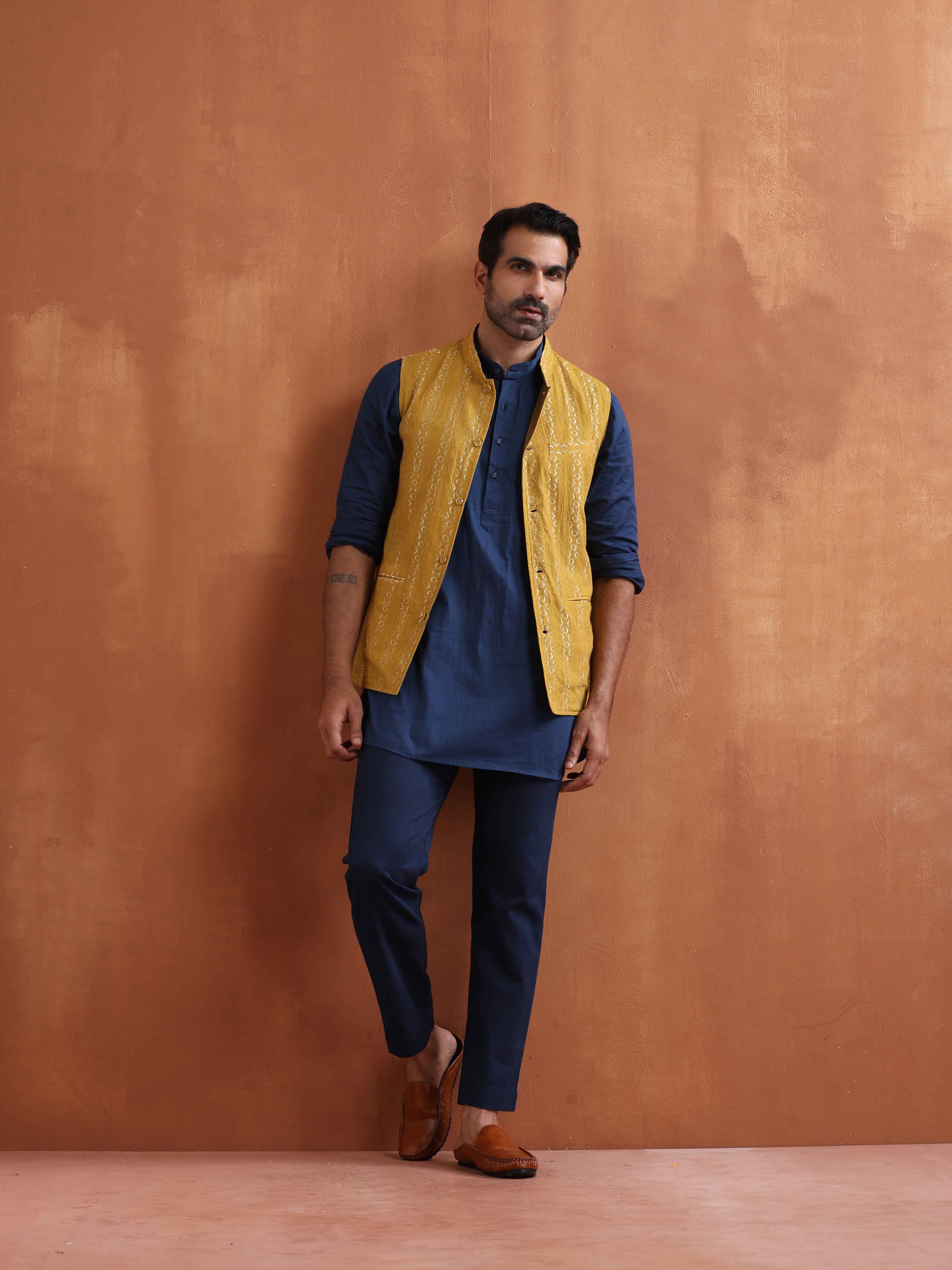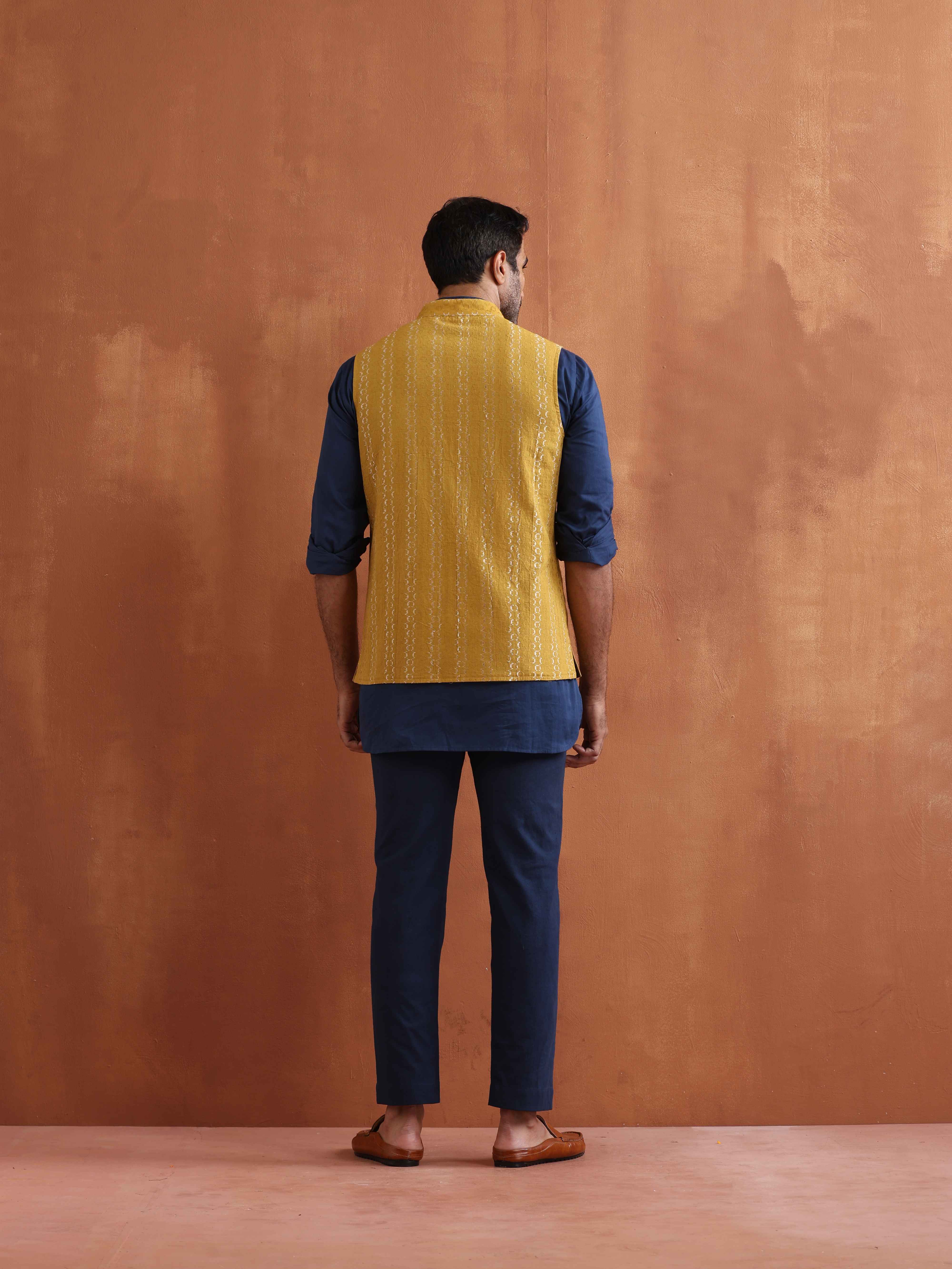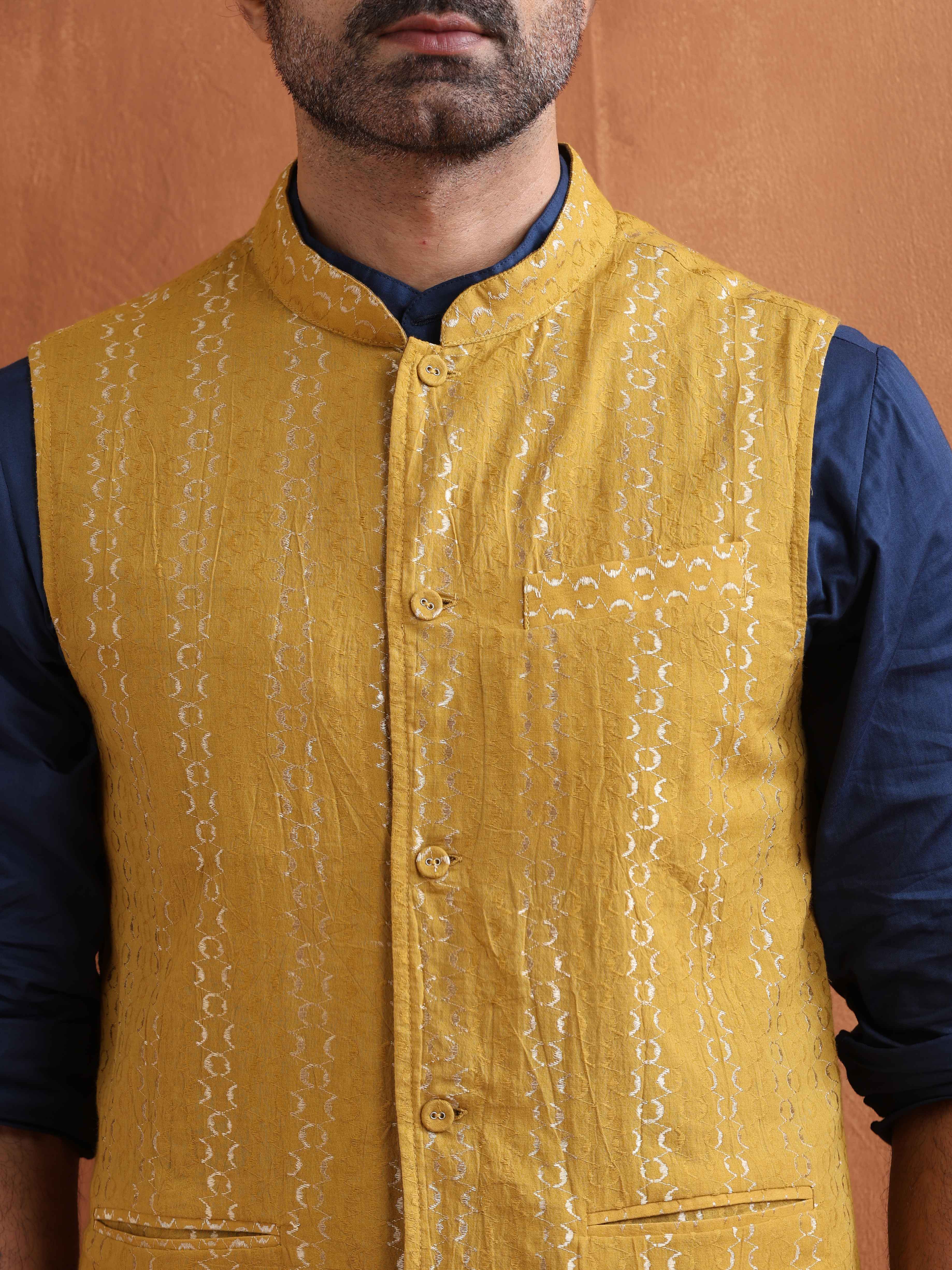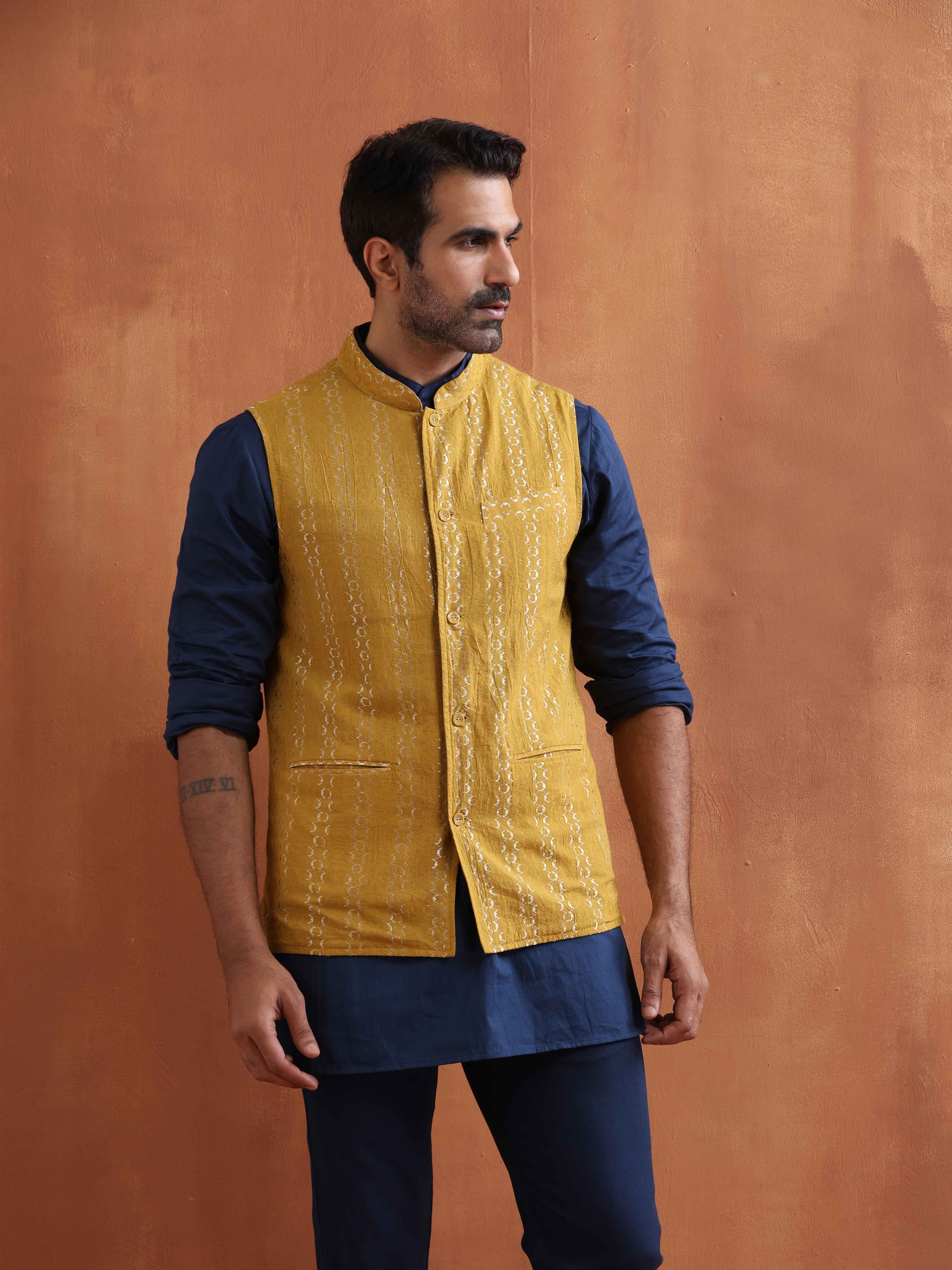 • Upgrade your festive wardrobe with this mustard cotton dobby reversible nehru jacket.