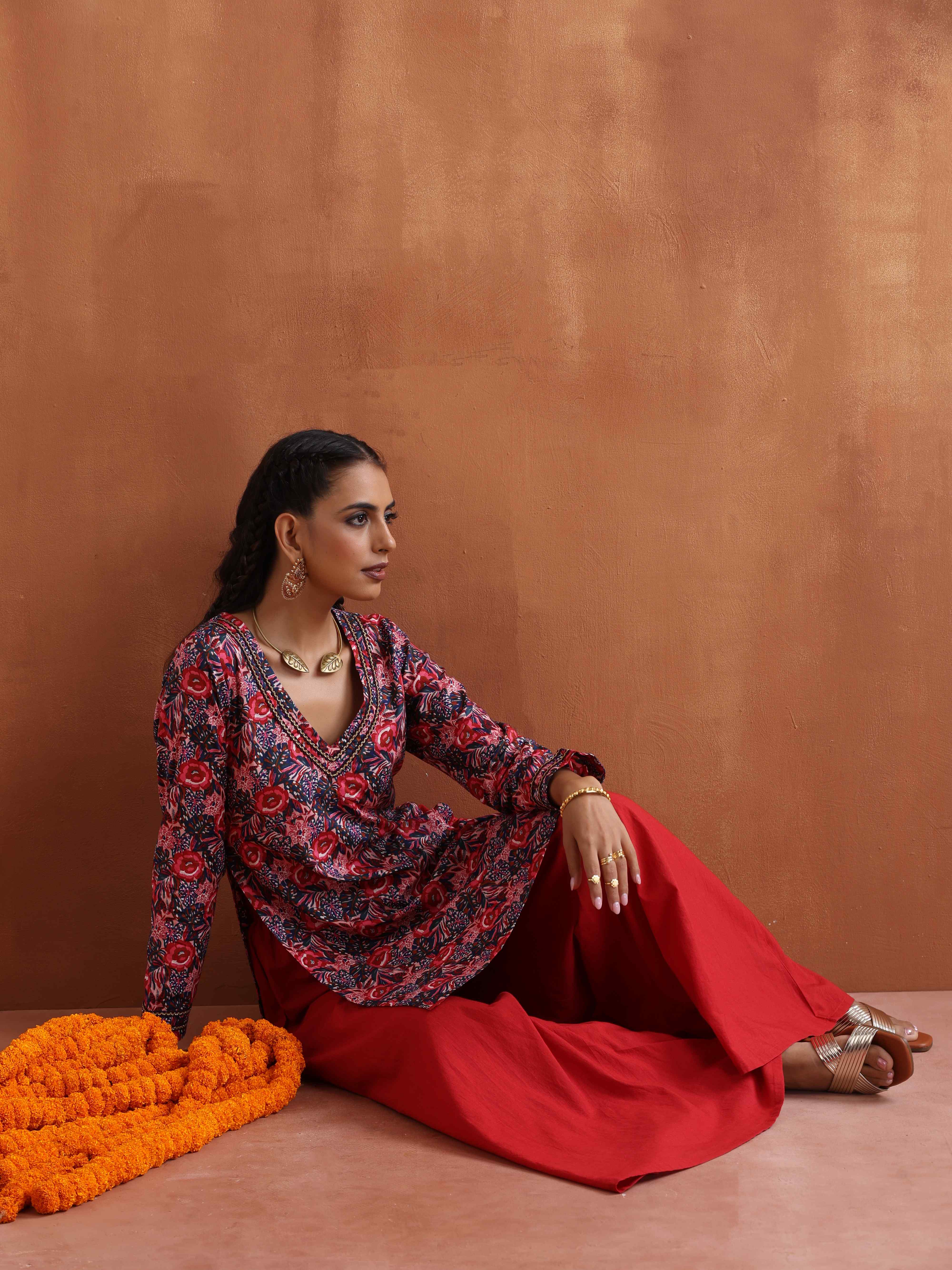 trueBrowns Pink Print Sharara SetDescription Elevate your style with this pink floral print kurta paired with red cotton sharara. It's an ideal ble...