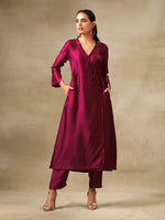 • Purple silk-blend angrakha kurta set with v-neck and cuff details in the sleeves. It has pockets on both the sides. Paired with purple pair of pants. Color and cut will stand out in every Festive Occasion.