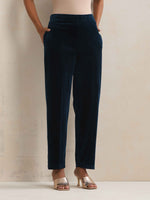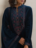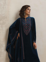 trueBrowns Blue Velvet Floral Embroidered Kurta Pant Dupatta Set - S-M