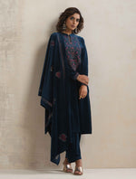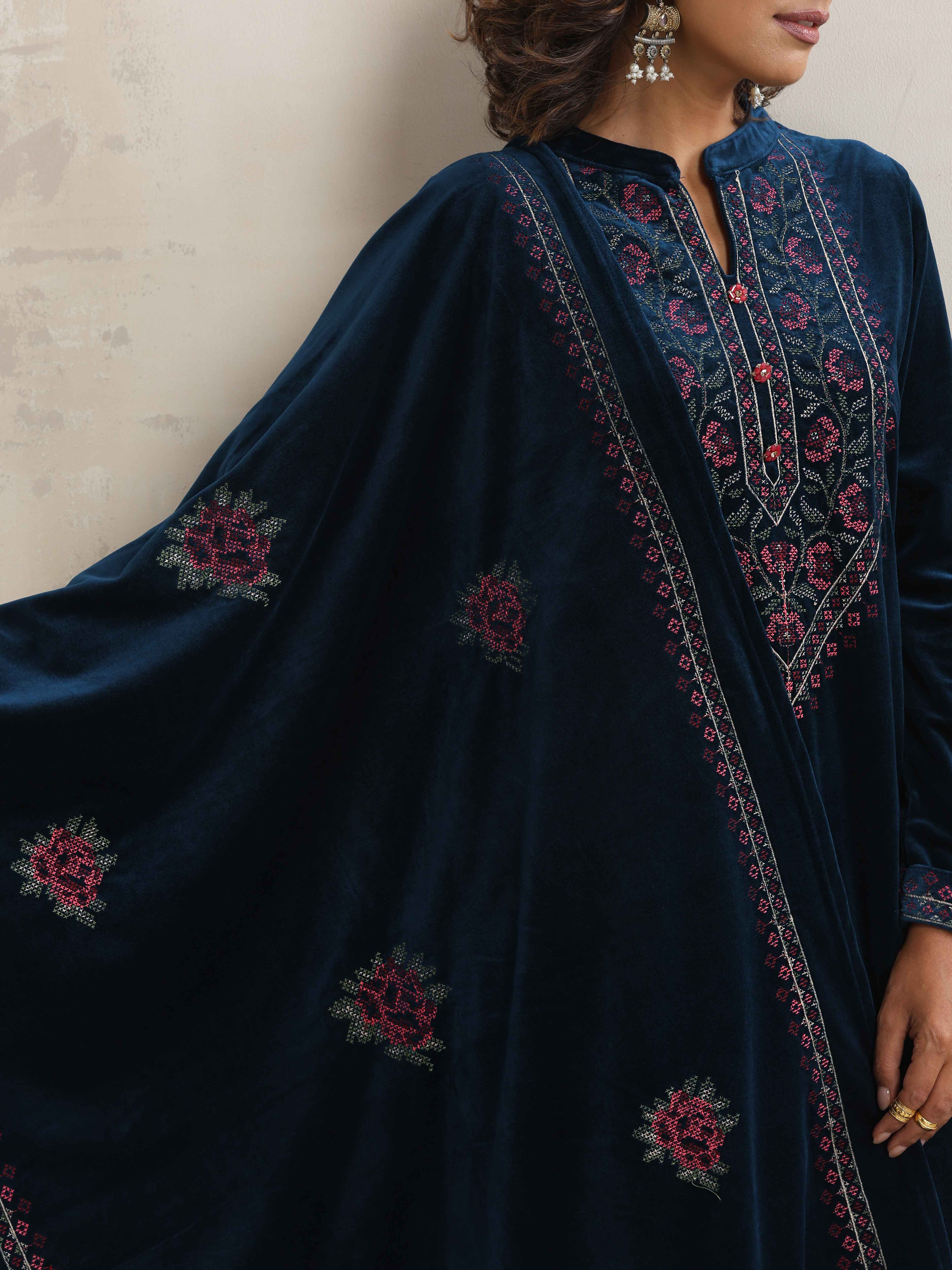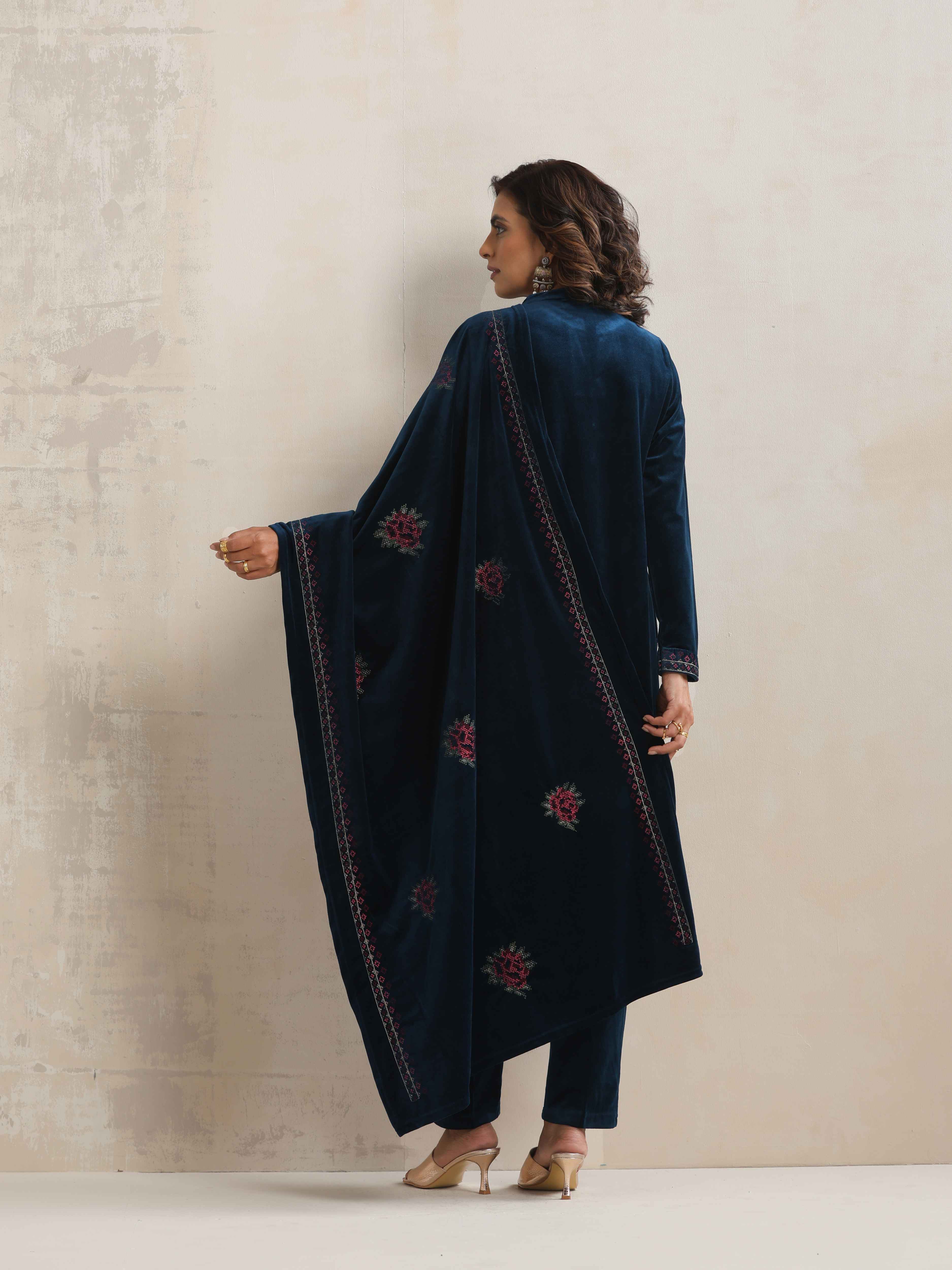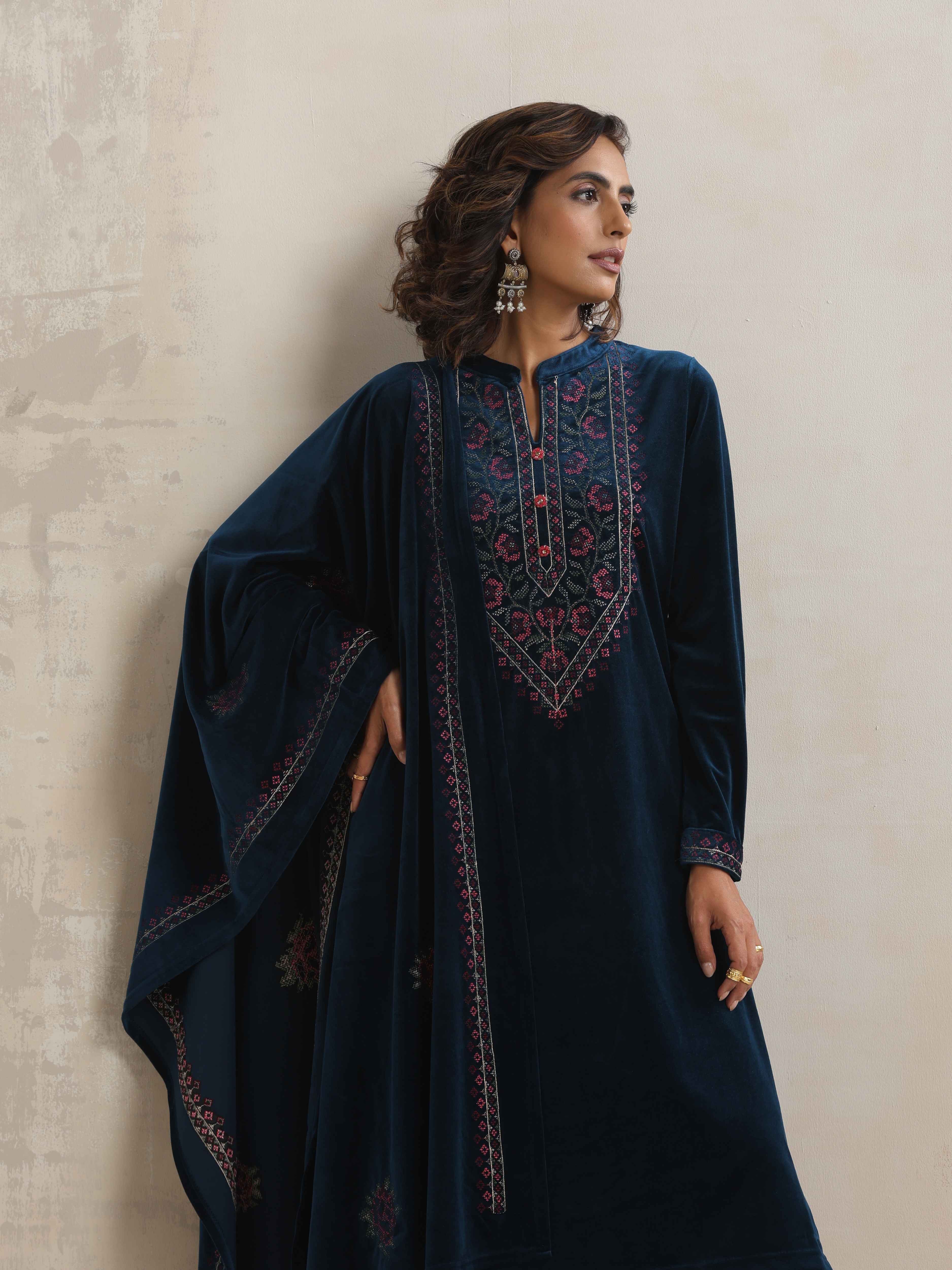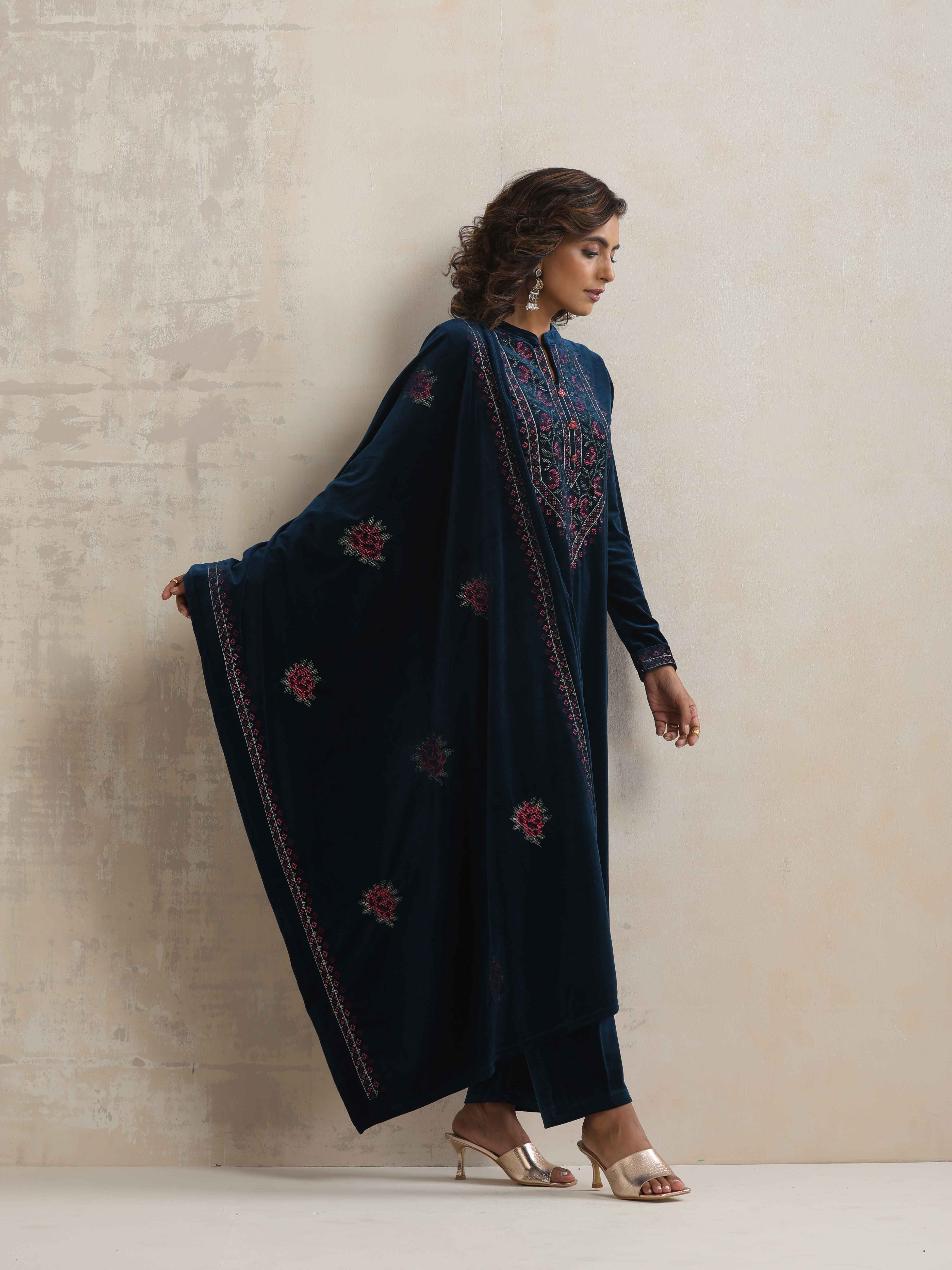 trueBrowns Blue Velvet Floral Embroidered Kurta Pant Dupatta Set