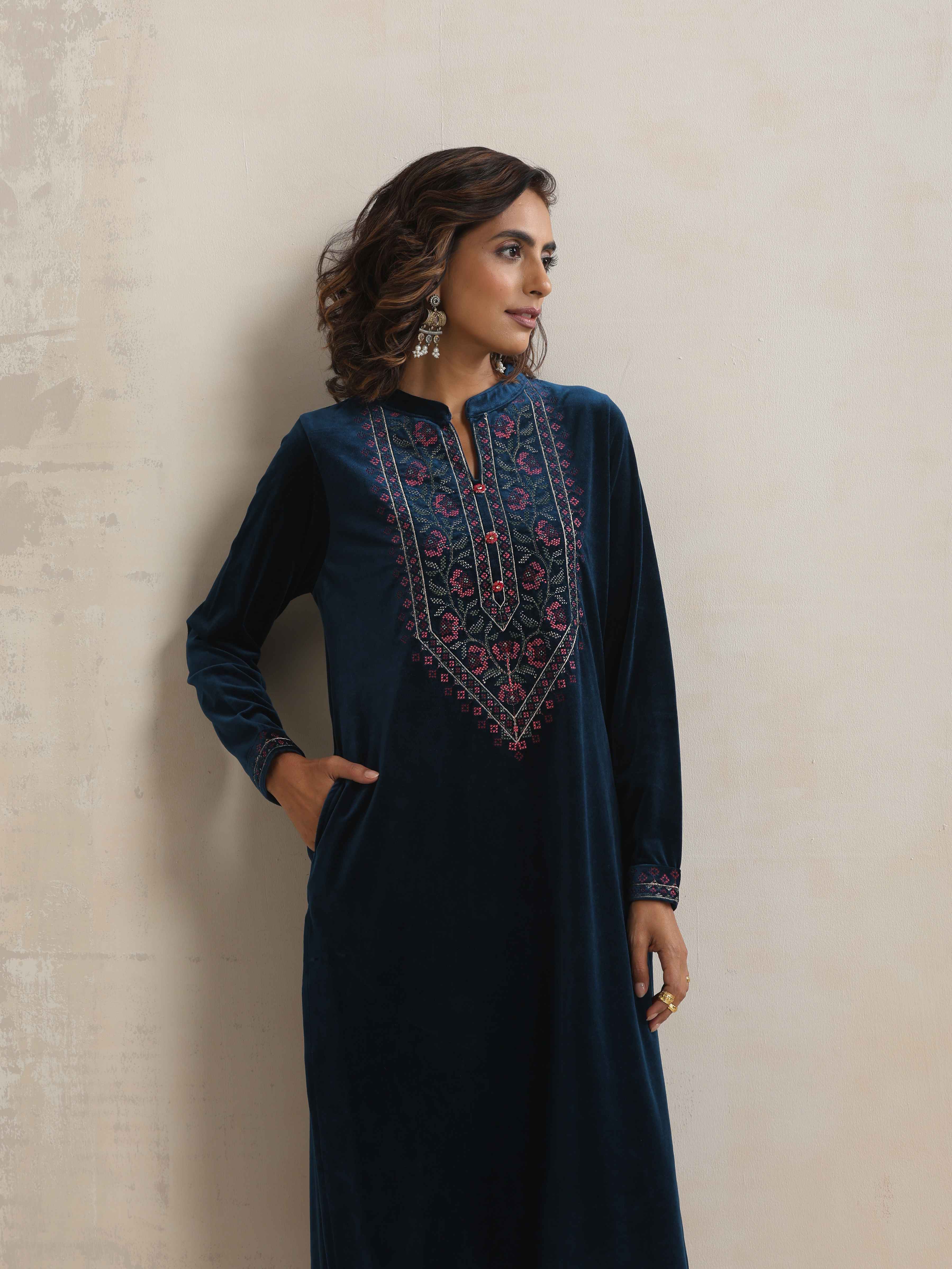 trueBrowns Blue Velvet Floral Embroidered Kurta Pant Dupatta SetDescription Elevate your style with this blue velvet floral embroidered kurta pant ...