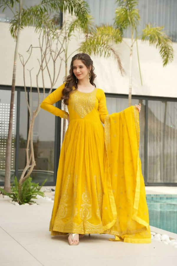 Vastranavya Yellow Faux Blooming with Embroidery Zari Sequins Work Gown - M
