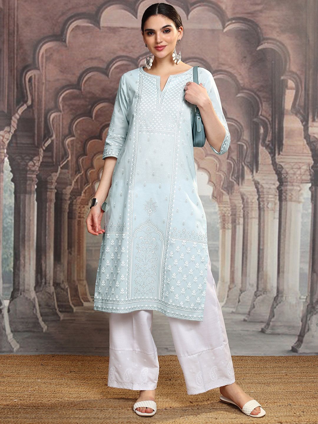 Vishudh Blue Ethnic Motifs Printed Notch Neck Straight Kurta - Distacart