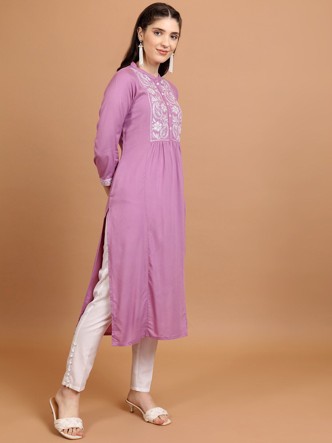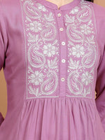 Vishudh Floral Embroidered Straight Kurta Product Details Colour: mauve & white Floral yoke designed Mandarin collar Three-quarter, regula...