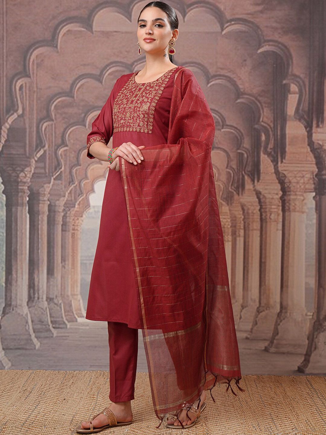 Vishudh Floral Yoke Design Regular Thread Work Kurta with Trousers & With Dupatta Product Details Red yoke design Kurta with Trousers with d...