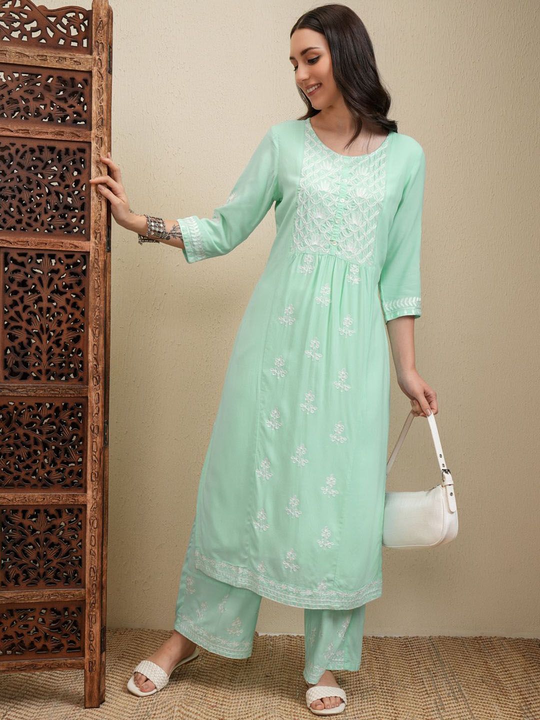 Vishudh Green Floral Embroidered Thread Work Regular Kurta with Trouser Product Details Green, white embroidered Kurta with TrousersKurta design...