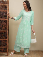Vishudh Green Floral Embroidered Thread Work Regular Kurta with Trouser