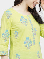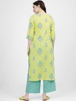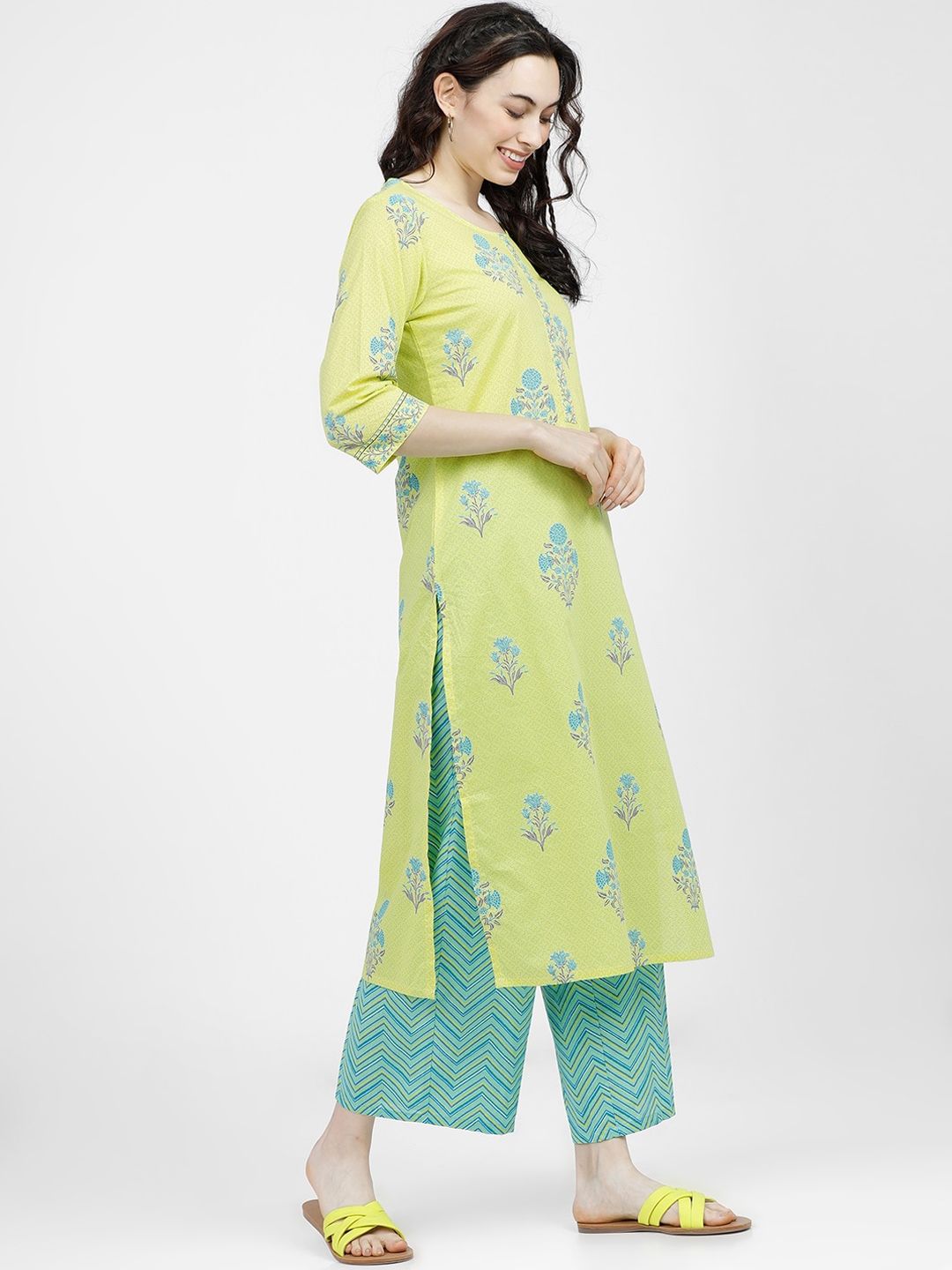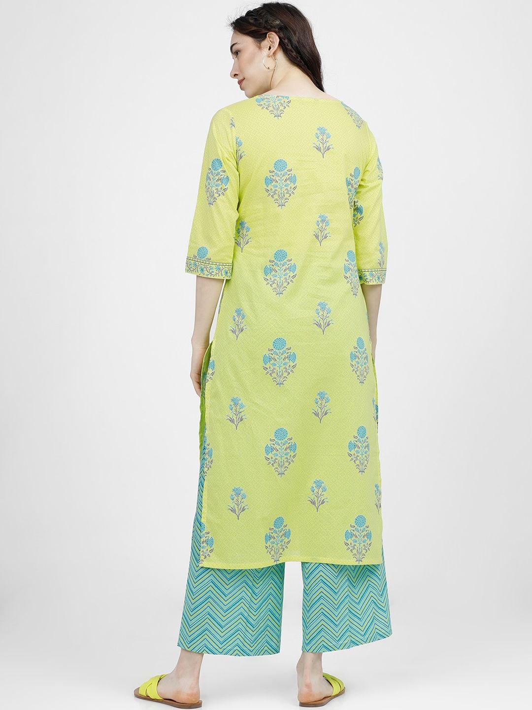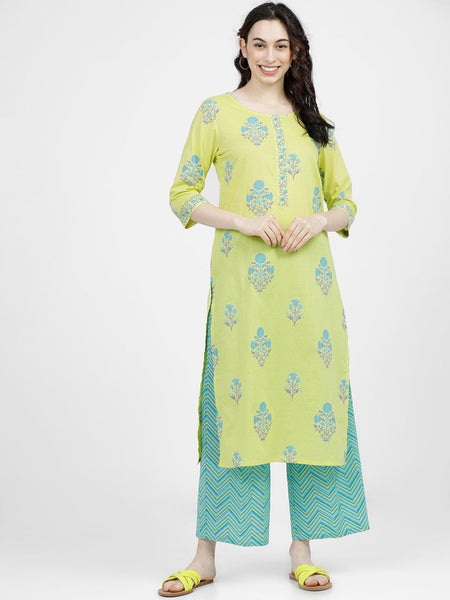 Vishudh Women Lime Green Ethnic Motifs Printed Regular Pure Cotton Kurta with Palazzos - Distacart