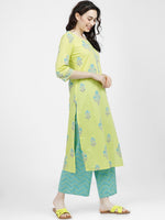 Vishudh Women Lime Green Ethnic Motifs Printed Regular Pure Cotton Kurta with Palazzos