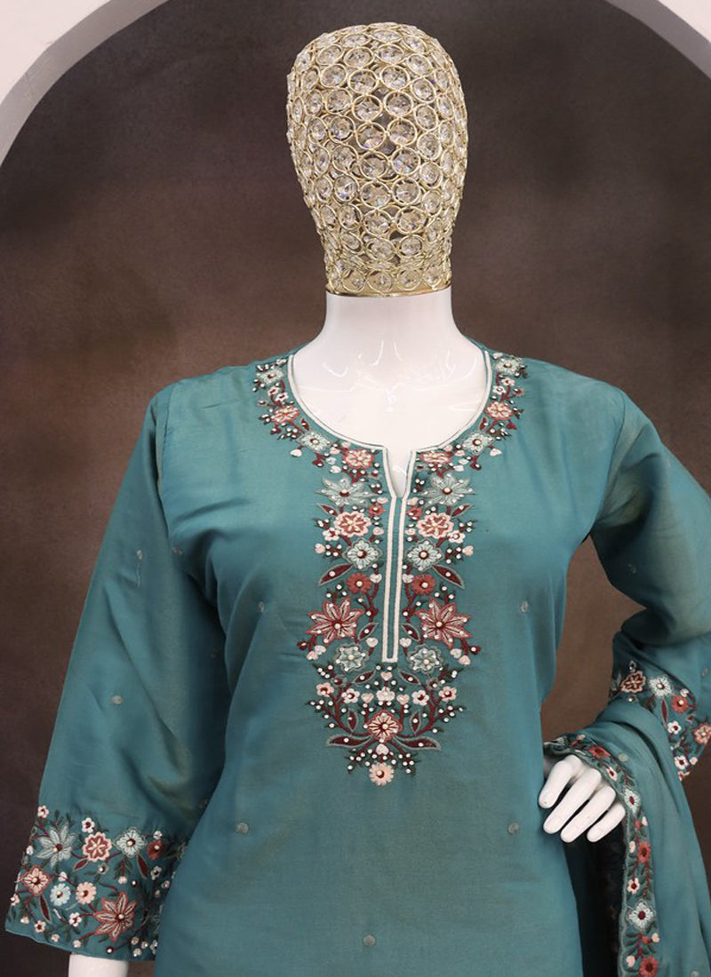 Vegaa Fashion Turquoise Simar Silk Embroidered Palazzo SuitAbout the Product:Wedding suit is the perfect choice for Indian festive or wedding event...
