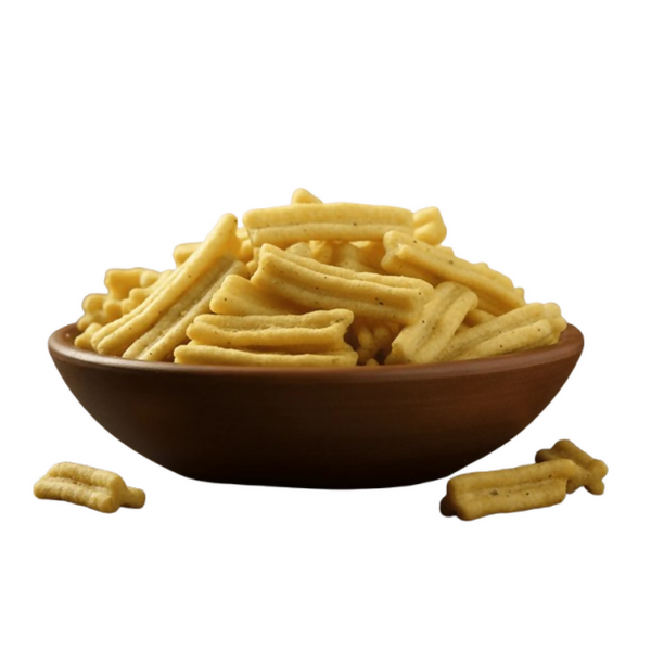 Besan Gathia is a hugely popular, deep-fried savory snack, originating from the western regions of India, particularly Gujarat. It is instantly recognizable for its thick, soft, and slightly spongy texture, making it distinct from the finer Sev. Gathia is made primarily from gram flour (besan) dough, which is generously seasoned with aromatic spices like carom seeds (ajwain), and sometimes black pepper and turmeric. The dough is extruded into thick, short ribbons and fried until perfectly cooked but retaining a pleasant chewiness rather than a brittle crunch. It is a hearty and satisfying tea-time snack that is soft, savory, and incredibly flavorful.