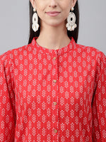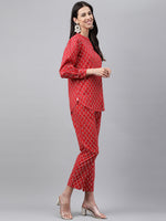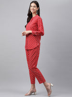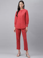 Janasya Women's Red Cotton Ethnic Motifs Regular Casual Top Set