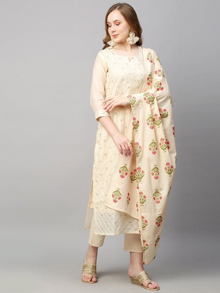 Cream-coloured printed Kurta with Trousers with dupatta