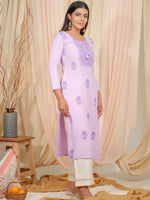 Ode by House of Pataudi Floral Embroidered Tie-Up Neck Straight Kurta Product Details Colour: purple Floral Embroidery Tie-Up Neck Three-Quart...