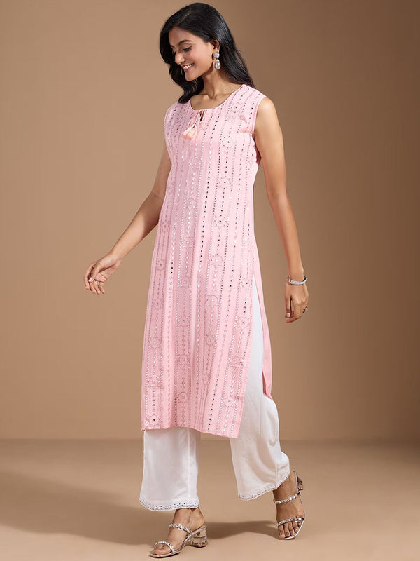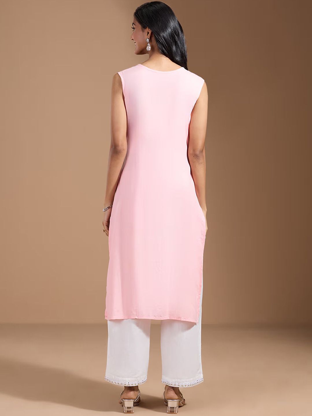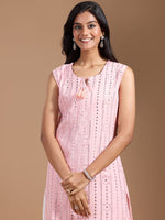 Ode by House of Pataudi Women Striped Thread Work Kurta Product Details Colour: pink Striped V-neck Sleeveless, no sleeves A-line sha...