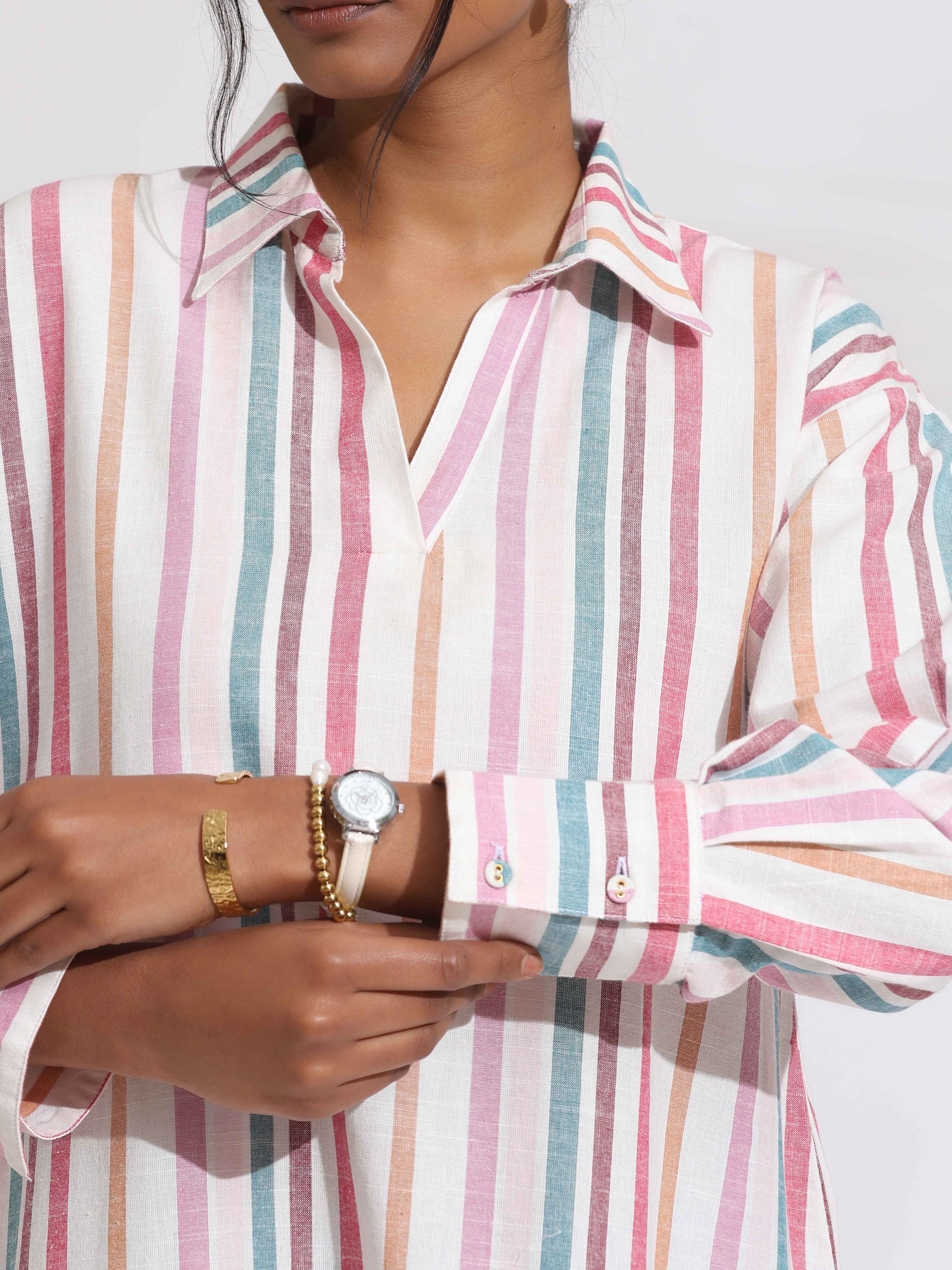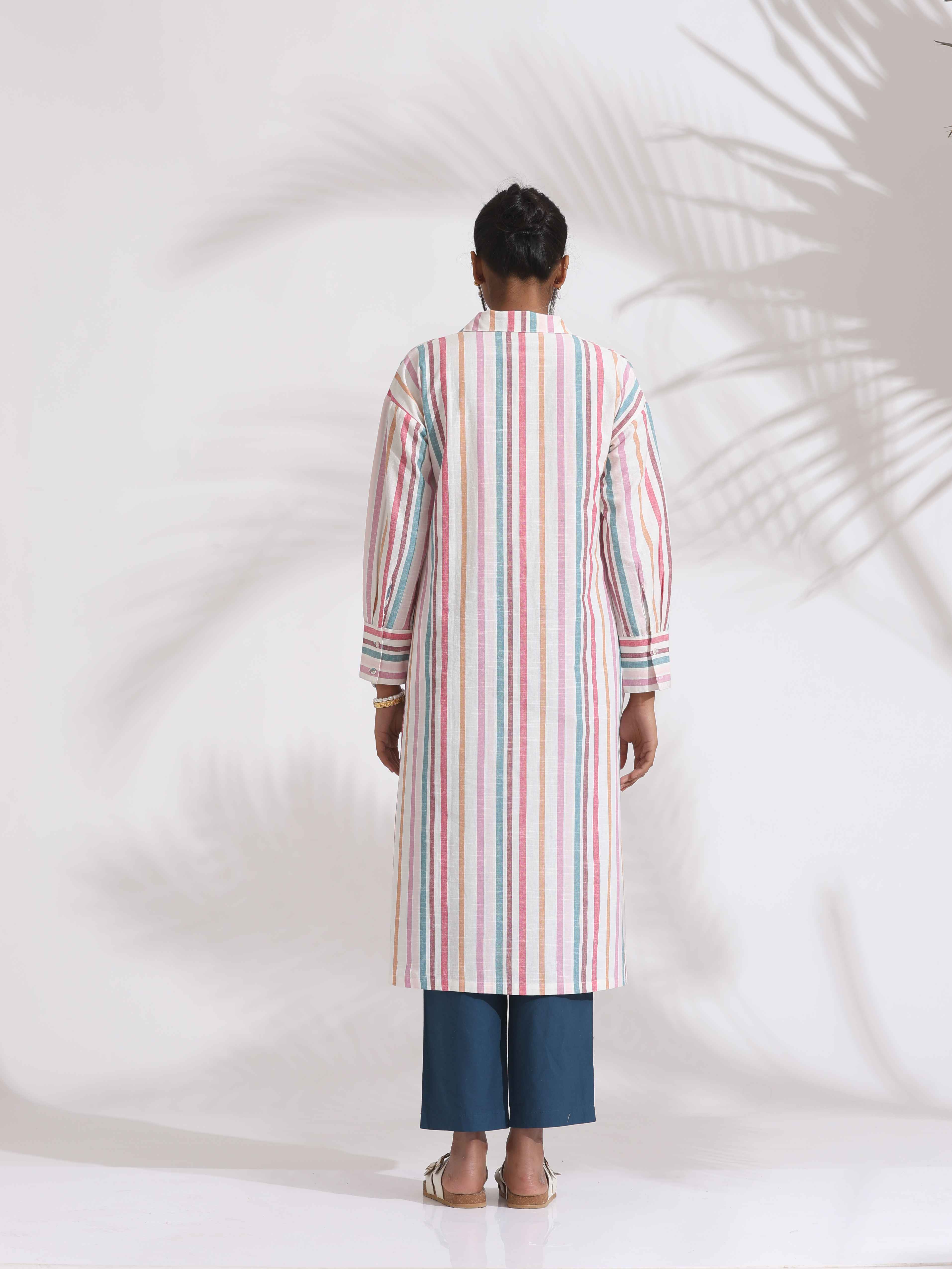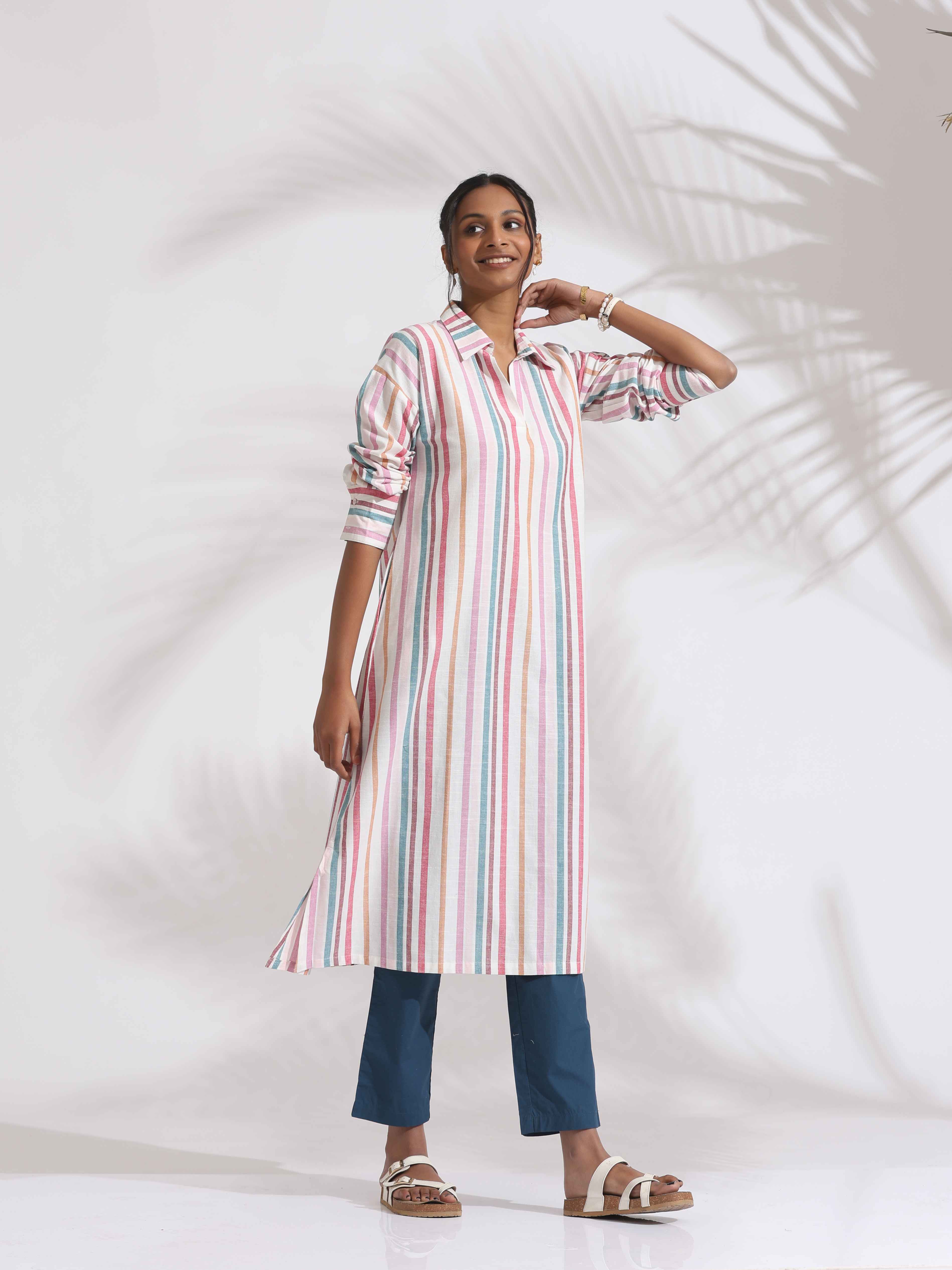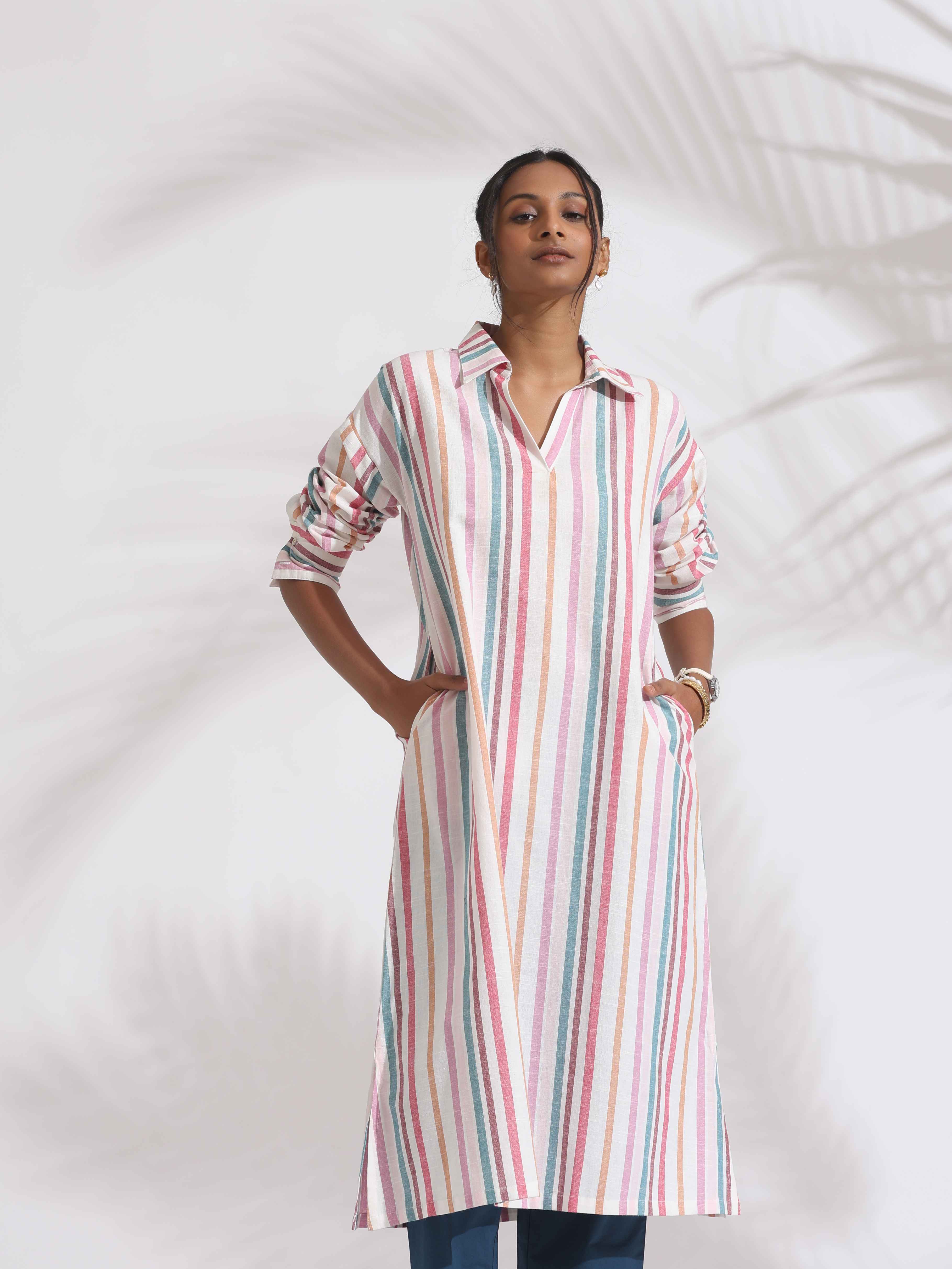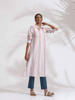 trueBrowns Off-White Cotton Multi Stripe A-line Kurta SetDescription Elevate your style with this stripe cotton A- line drop shoulder kurta paired ...
