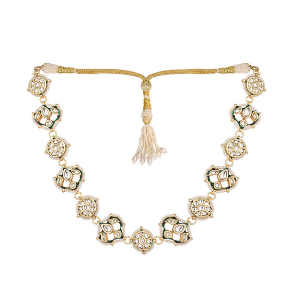 22K Gold- toned, this handcrafted necklace features tiny white pearls, accented with kundan.Detailed with gold-toned floral designs. Can be worn as Maatha patti and a necklace too. Secured with an adjustable drawstring closure. This comes with anti-tarnish and hypoallergenic for lasting shine and comfort.