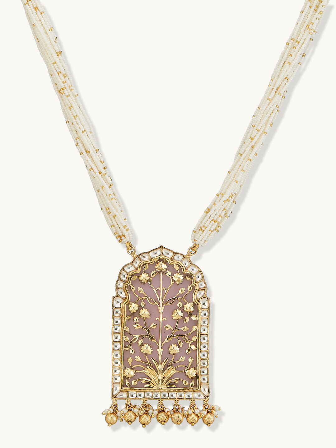 Nuyug 22K Gold-Plated Pearl Beaded Strings Floral Motifs Enamel Pendant Necklace Set