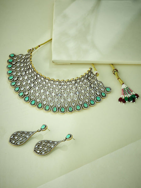 Nuyug 22k Gold-Plated Zircon Choker SetAbout the product:Exquisite gold-plated necklace set featuring intricate lattice design with turquoise stone...