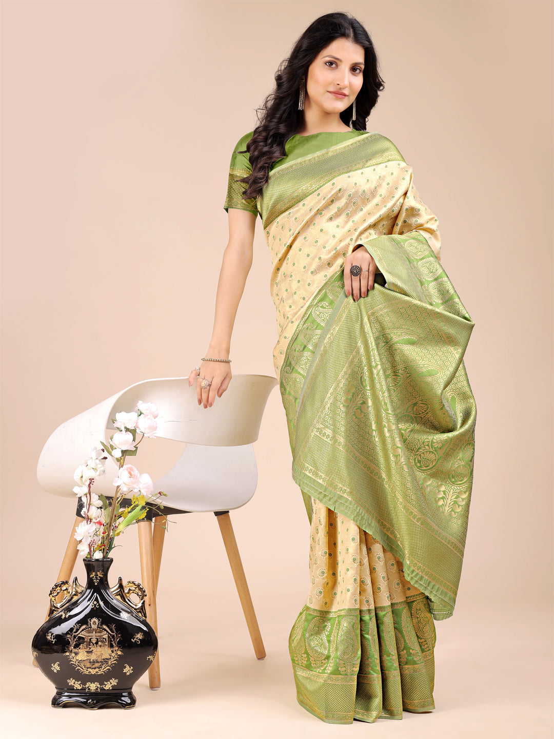 Astita Cream & Light Green Banarasi silk Woven Zari Work Traditional Tassel SareeASTITA brings to you this saree which is made from Banarasi si...