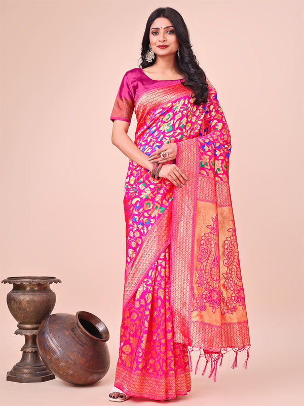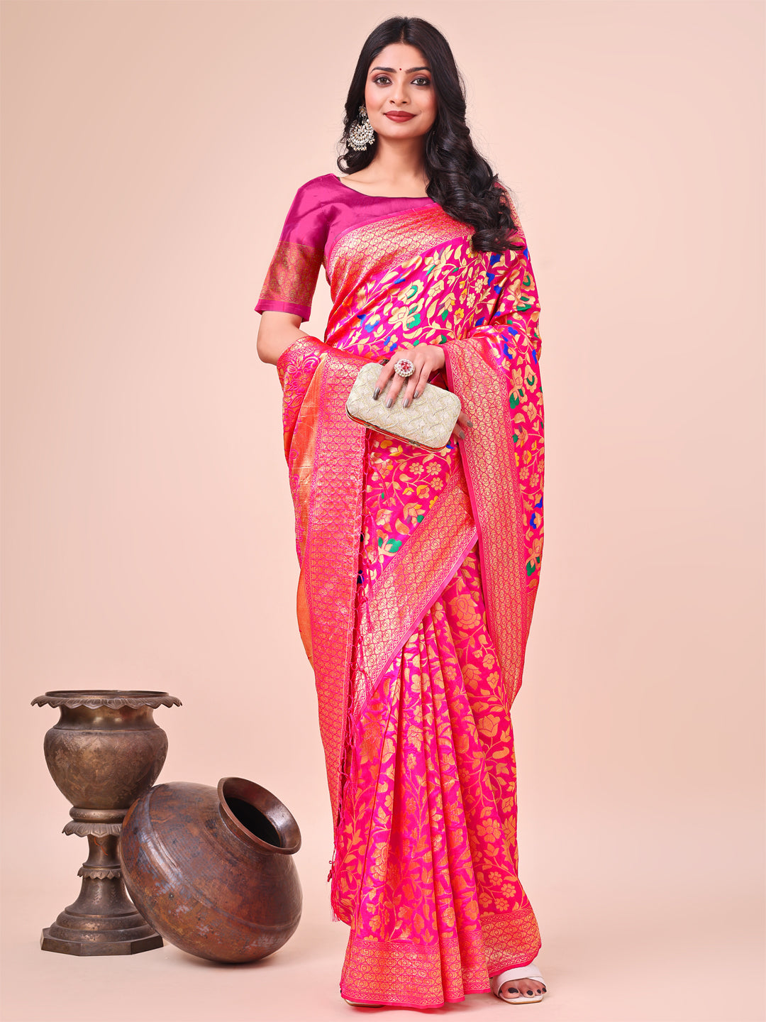 Astita Majestic Pink Silk Saree with Gold Zari & Floral Design - Perfect for Festive & Traditional Occasions - Distacart