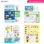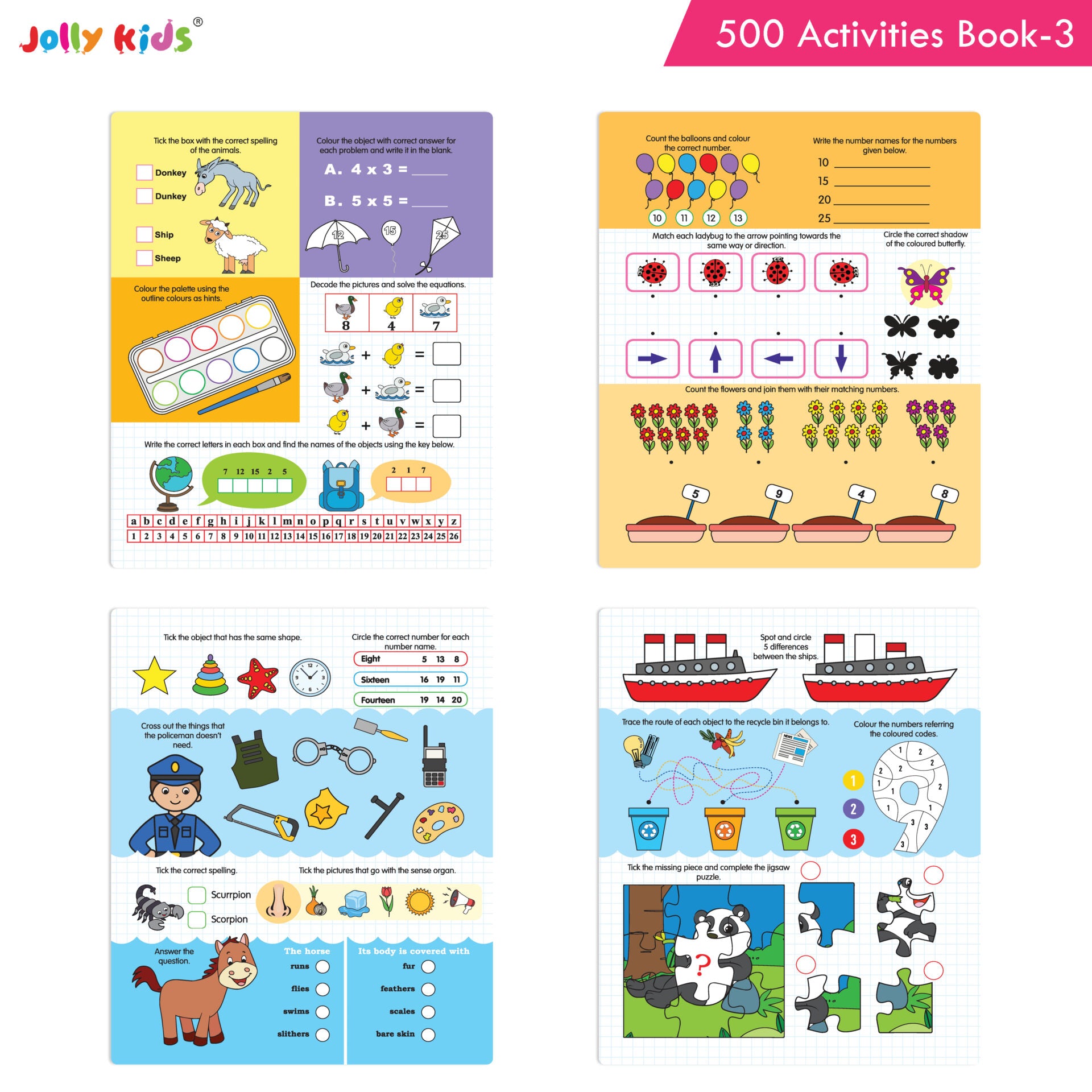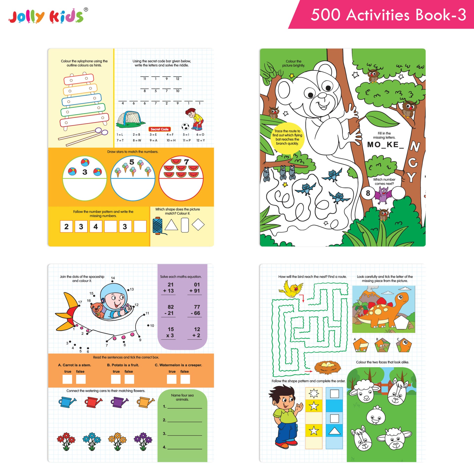 • Jolly Kids represent 500 activities book is designed for early learners to introduce math, language and logic. It Includes up to 500 different activities to keep your child productively engaged.It is a wonderful book teeming with a variety of educational fun-filled activities to enhance reading, problem-solving, imagination, coordination and motor skills. These books focus on learning a variety of educational activities to enhance counting, jumble words, missing letters, colouring, differences between pictures, learning shapes, dot-to-dot activities, learn greater & less than signs, drawing, decode the pictures & solve the sums and many more activities in the books.