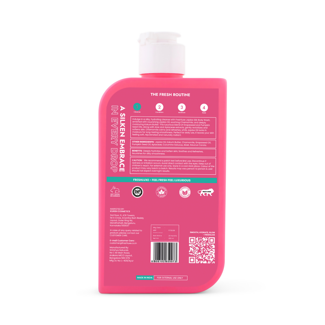 Indulge in a silky, hydrating cleanse with FreshLuxe Jojoba Silk Body Wash, enriched with nourishing Jojoba Oil, soothing Chamomile, and deeply moisturizing Kokum Butter. This luxurious blend of Grapeseed and Pumpkin Seed Oils, along with Aloe and Apiaceae extracts, gently revitalizes and softens skin. Chamomile calms and refreshes, while Jojoba Oil locks in moisture for long-lasting smoothness. Perfect for daily use, it leaves your skin feeling soft, rejuvenated, and naturally radiant.