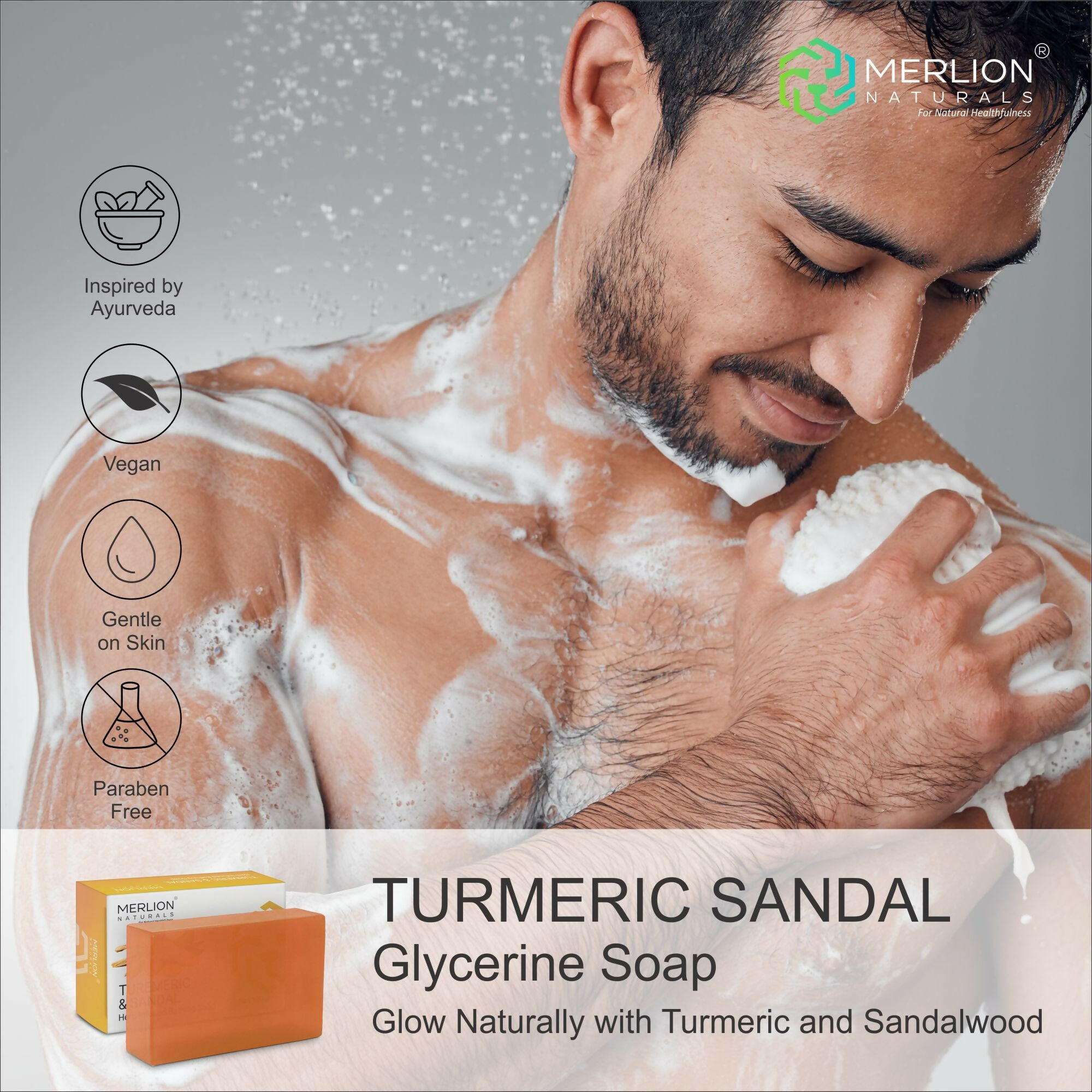 Merlion Naturals Turmeric & Sandal Glycerine Soap is a handmade herbal soap bar suitable for use on both face and body. Each bar contains a blend of plant-based ingredients, including turmeric and sandalwood, in a glycerine-rich base.