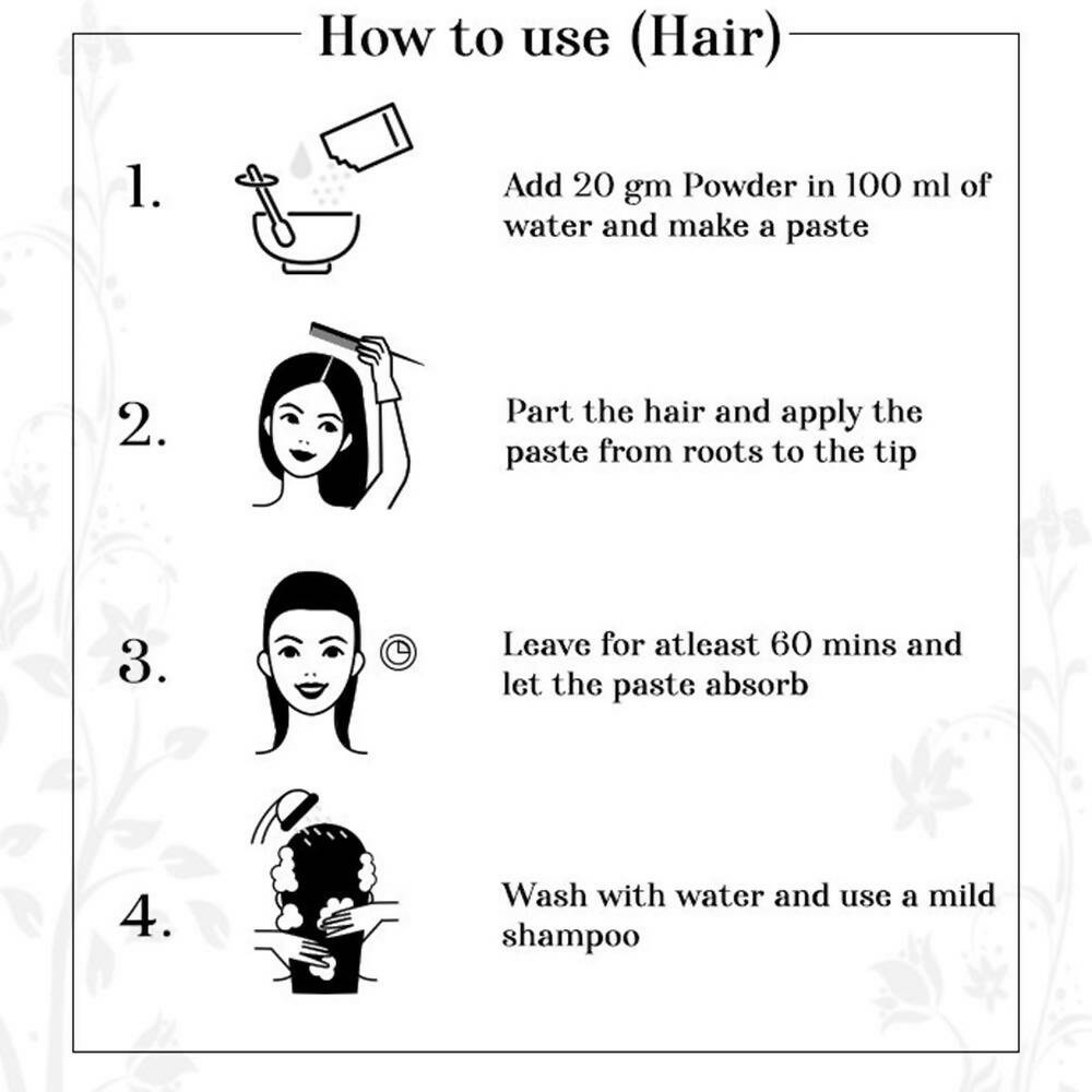 • Hair: Mix powder & water to form a paste. Apply the paste from root to tip for 6 mins. Rinse with water