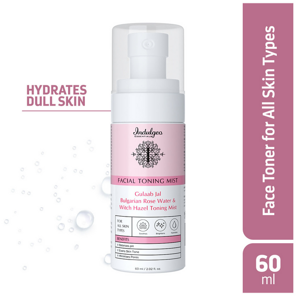 Indulgeo Essentials Gulaab Jal Facial Toning Mist is crafted with the finest Bulgarian rose water and the exclusive witch hazel extract. The Bulgarian rose petals, distilled into pure rosewater, rejuvenate dehydrated skin, bestowing a natural, dewy, and radiant glow. Rose water helps to maintain the skin's pH balance, reduces redness and inflammation, and has antibacterial properties that combat acne-causing bacteria. Its soothing properties can also help calm irritated skin and reduce puffiness. Rose water also acts as a natural astringent, tightening pores and toning the skin.