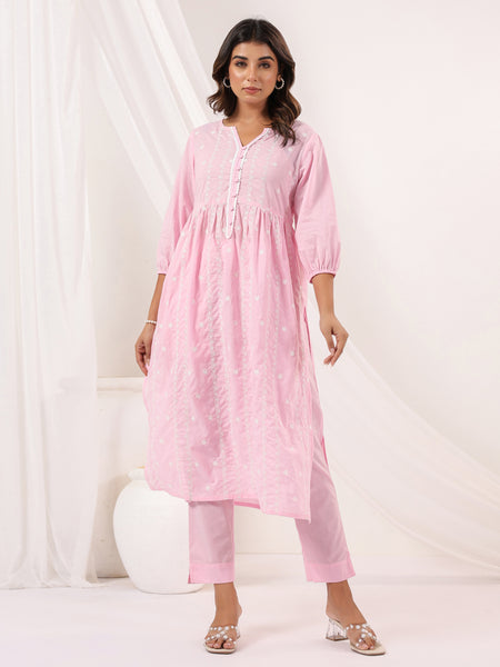 Janasya Light Cotton Embroidered ALine Kurta Set Top Fabric: Cotton Top Style: ALine Top Color: Light Top Pattern: Embroidered Top Neck: Notch...