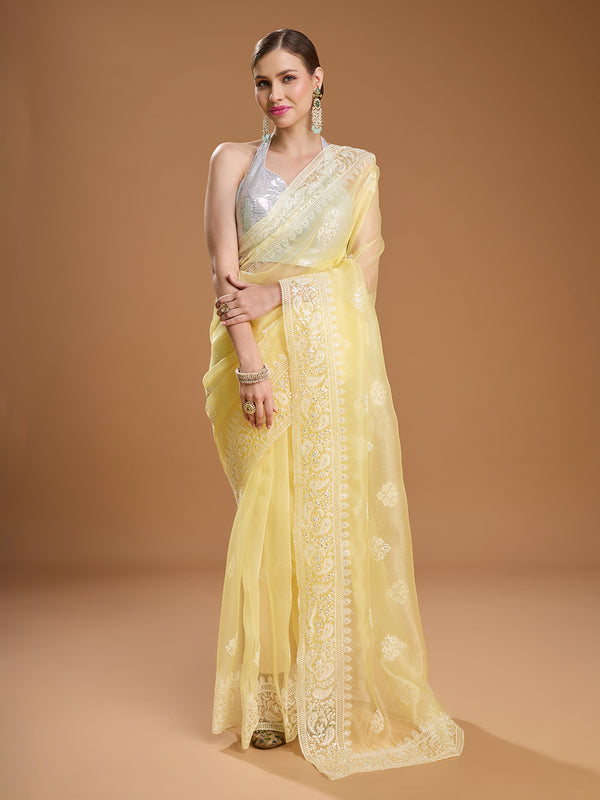 Jyoti Fashion Women's Yellow Net Sequins Embroidered Designer Saree with Blouse - Free Size