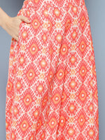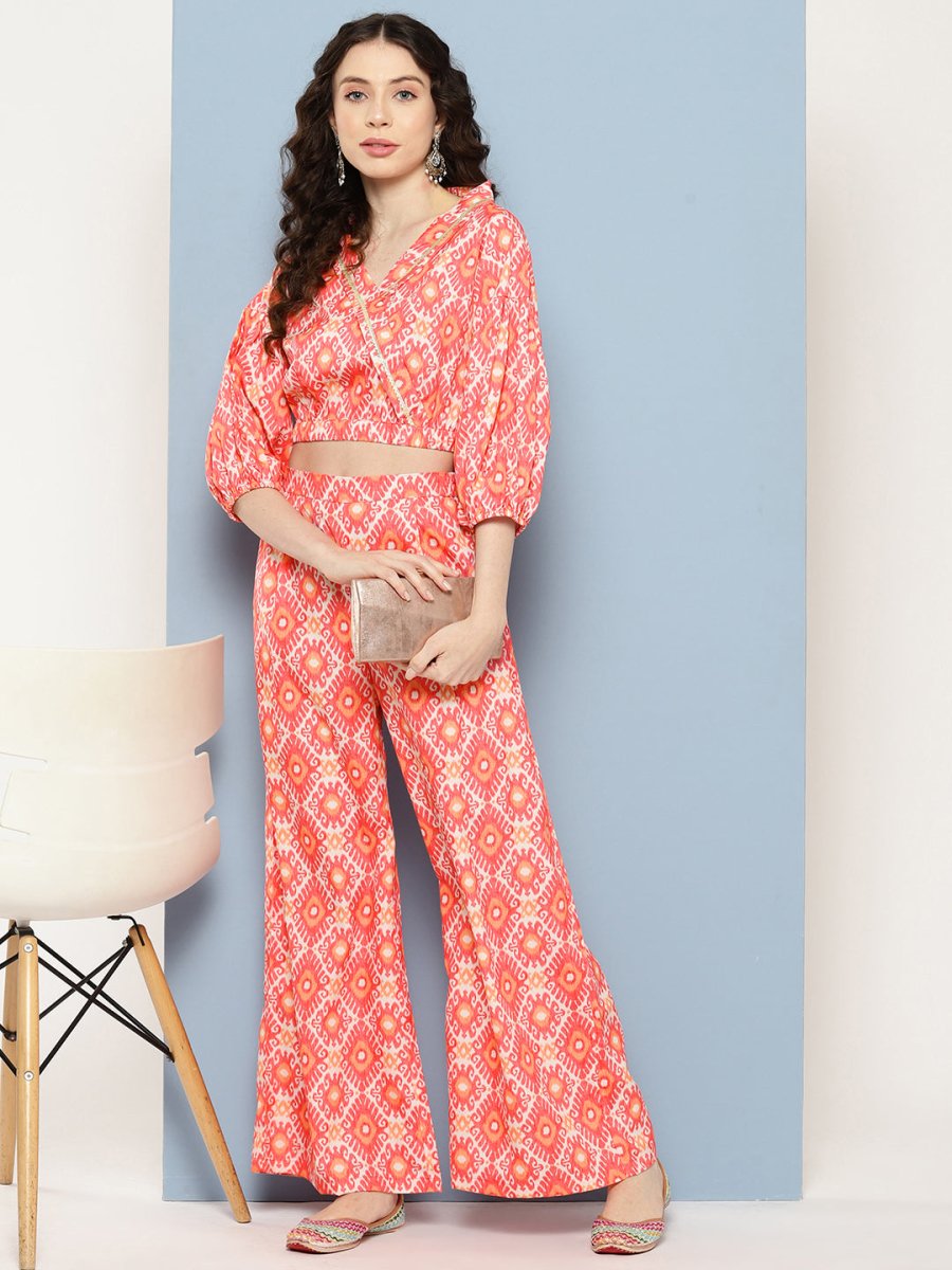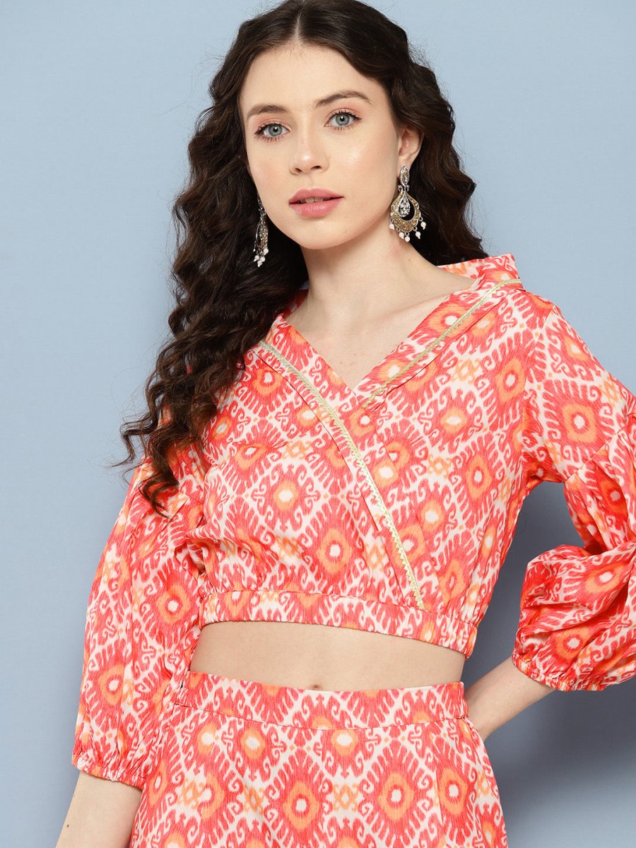Ahalyaa Printed Ethnic Co-Ords PRODUCT DETAILS  This co-ords set consists of co-ordsCoral red and off white  printed wrap top, has a  V-neck, wais...