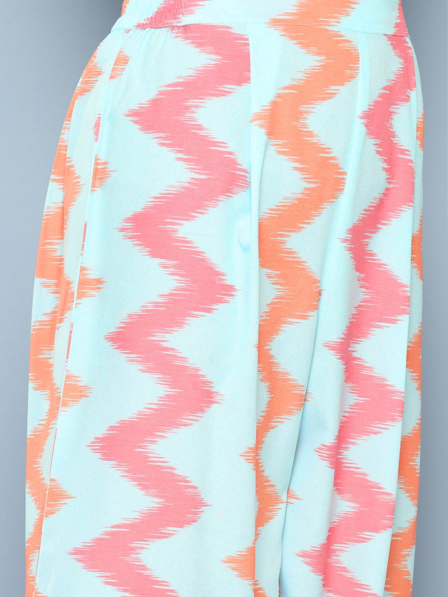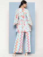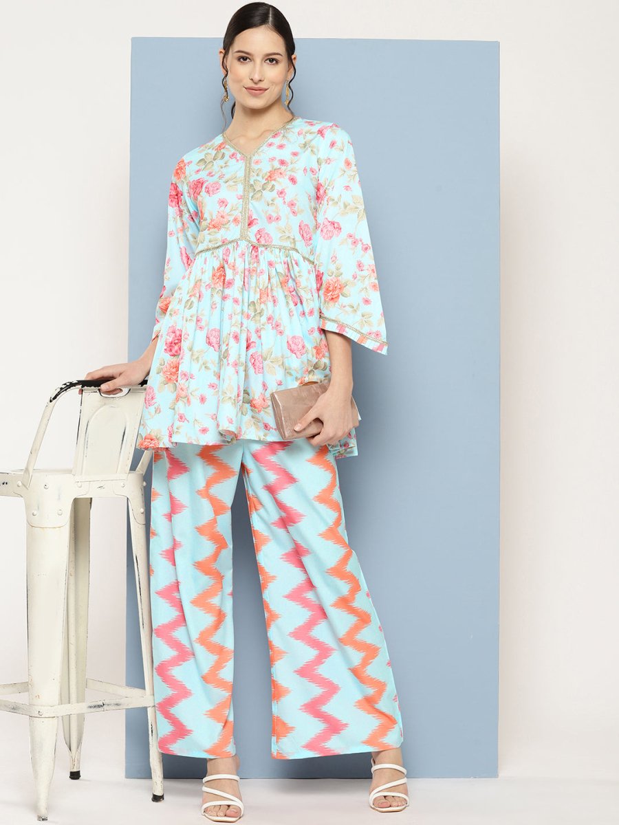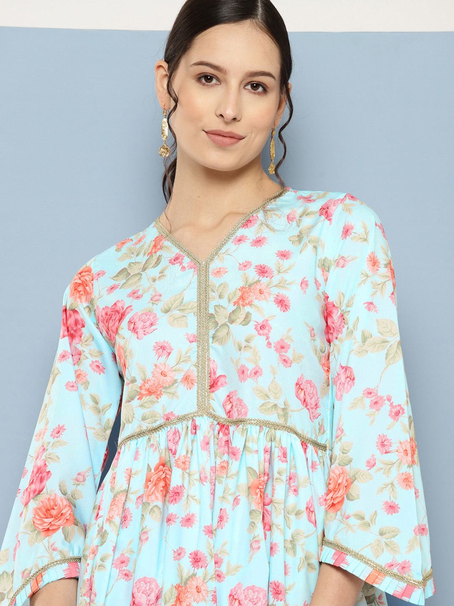Blue and pink printed tunic, has a round neck with button closure, three quarter flared sleeves