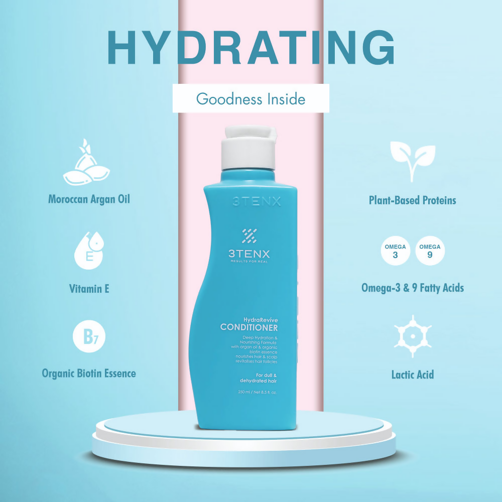 • Experience ultimate hydration and deeply nourished hair with 3TENX HydraRevive Conditioner. Our exclusive blend, enriched with Moroccan Argan Oil, Vitamin E, Omega-3 & 9 Fatty Acids and Organic Biotin Essence,safeguards, hydrates, and enhances manageability, leaving hair vibrantshiny and silky smooth.