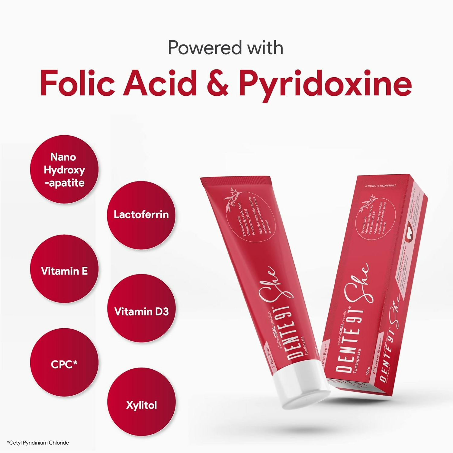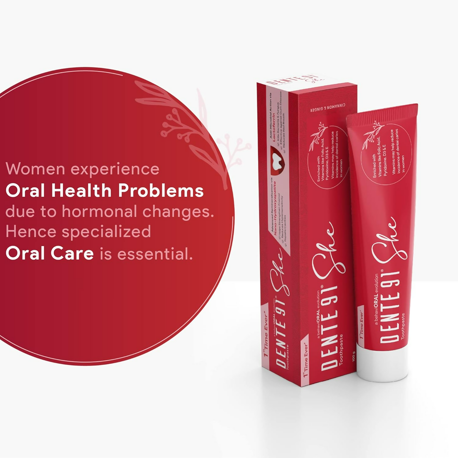 • Dente91 SHE Toothpaste is the first-of-its-kind toothpaste in India specially created to protect as well as augment women’s oral health. It contains Folic acid (Vitamin B9), Vitamin B6, Vitamin E and Vitamin D3 which helps to support women’s oral health across her lifespan.