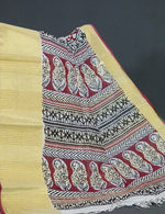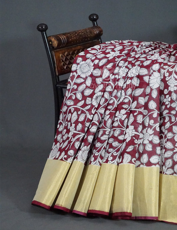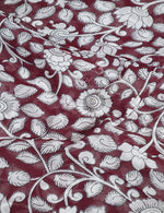 Saree Colour: Gleaming dark maroon colour saree with kalamakari creeper print design print all over the saree.