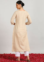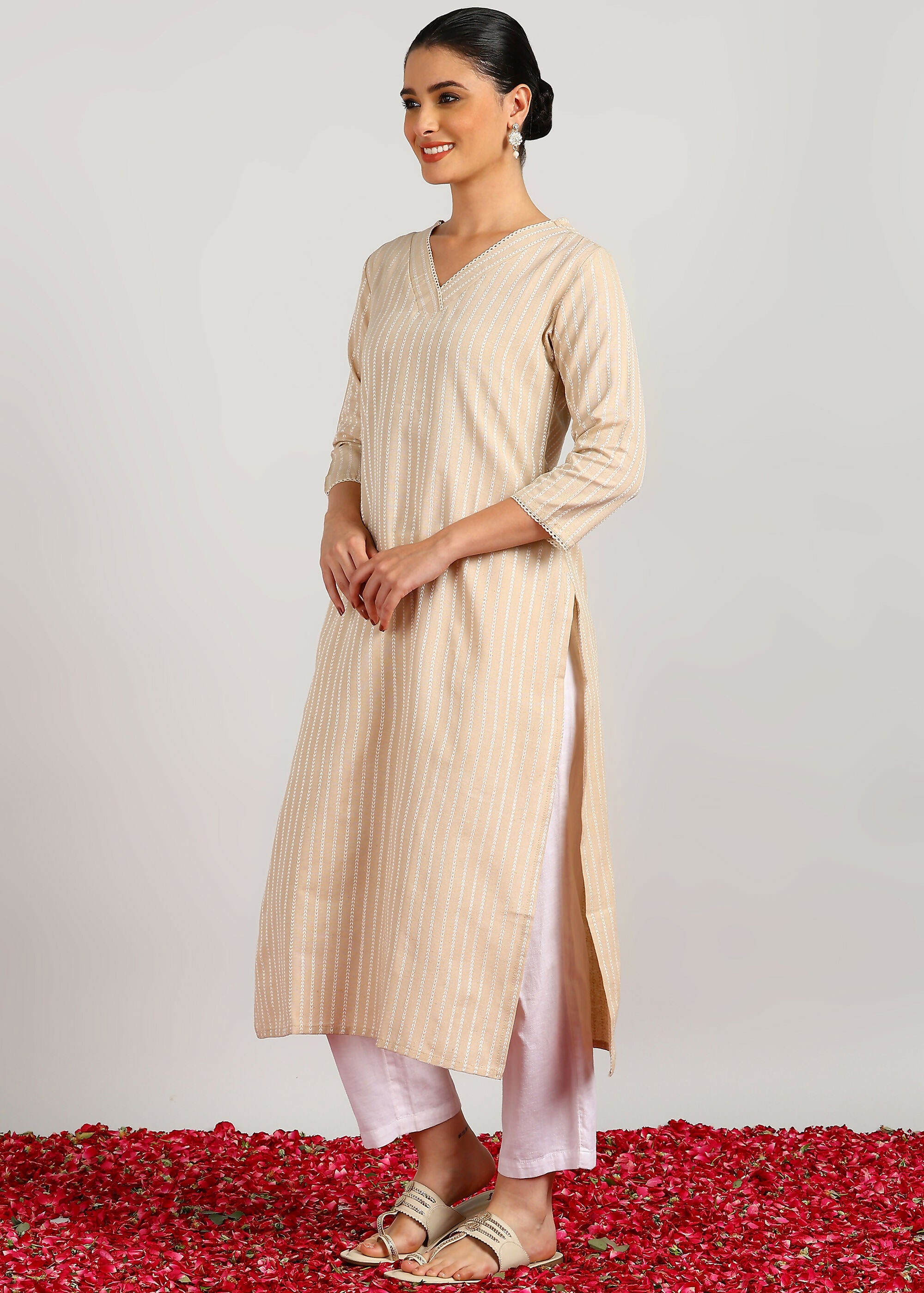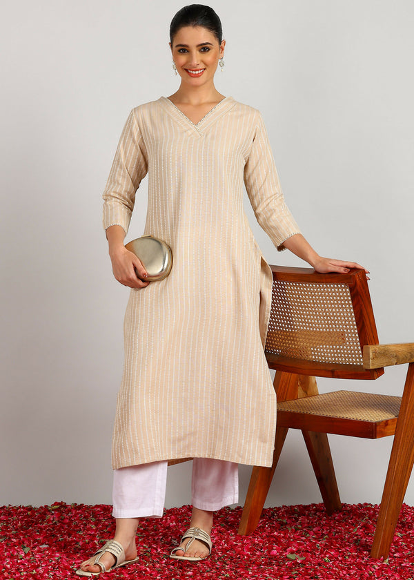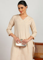 Redefine everyday elegance with this beige handwoven striped kurta, crafted from breathable yarn-dyed fabric. Featuring a V-neckline, 3/4th sleeves, and side slits, this straight kurta offers both comfort and style.Its subtle woven stripes add a timeless touch, making it perfect for office wear, casual outings, and semi-formal occasions. Pair it with white pants or palazzos and minimal jewelry for a graceful, contemporary ethnic look.