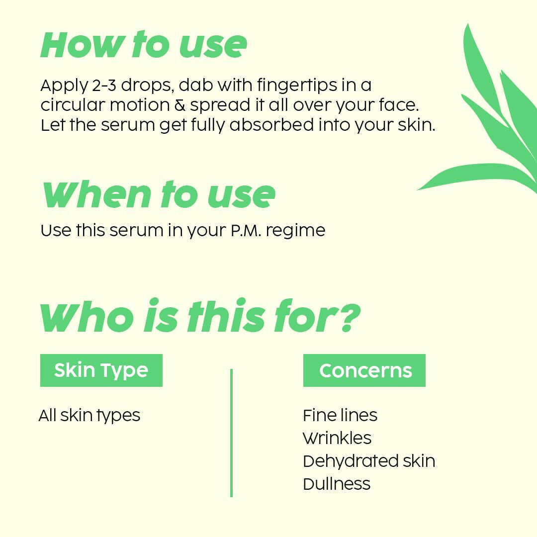 • Apply 2-3 drops, dab with fingertips in a circular motion & spread it all over your face. Let the serum get fully absorbed into your skin. Use this serum in your P.M. regime