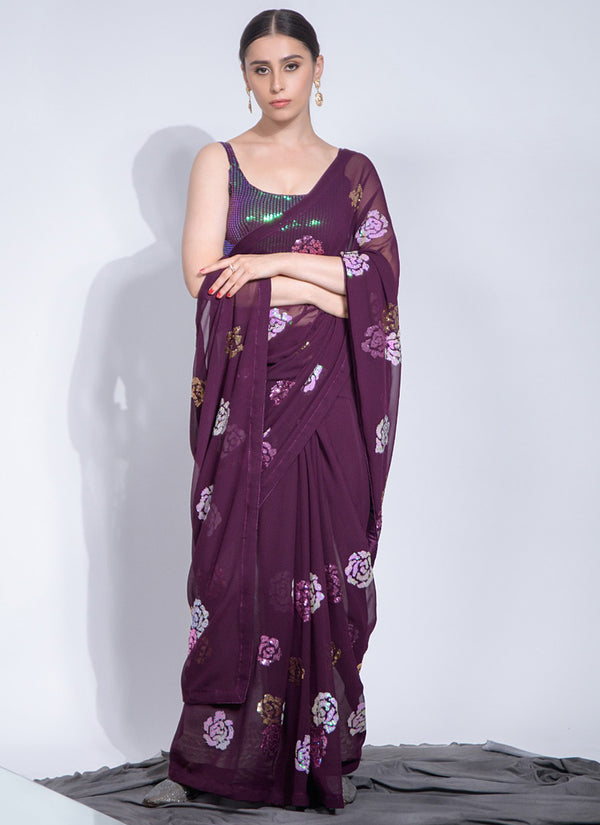 Vegaa Fashion Wine Georgette Sequence Flower Work Saree