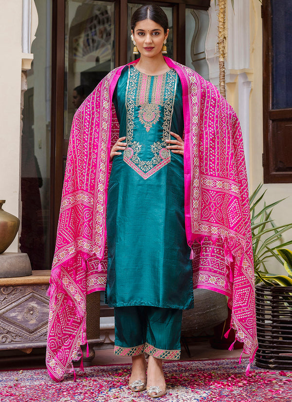 Vellora Silk Blend Rama Ocassional Wear Embroidery Work Readymade Salwar Suit