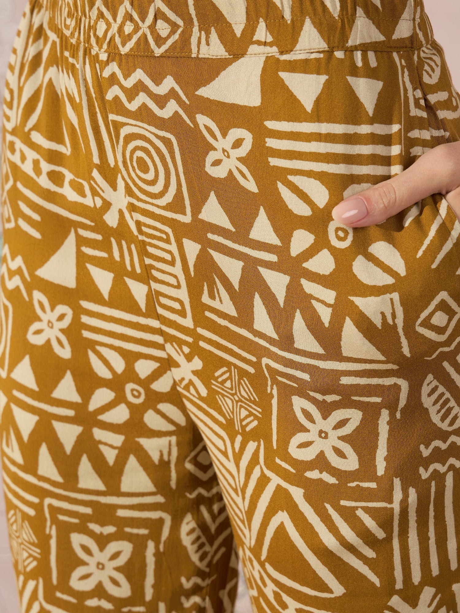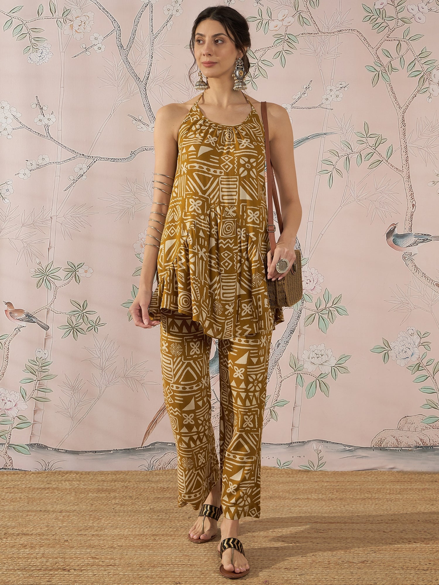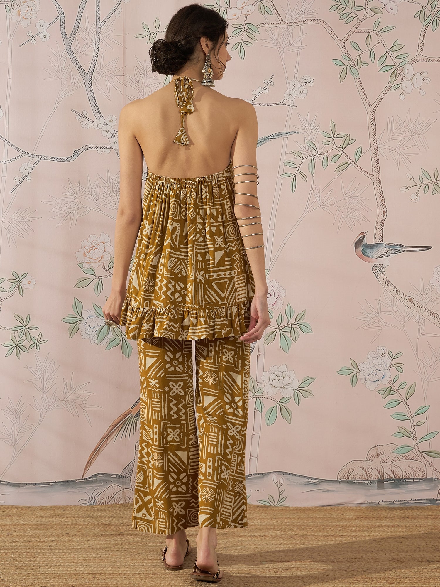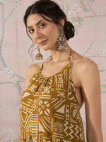 A vibrant dark yellow set with ethnic-inspired prints, featuring a halter strap design. The ethnic motifs add a touch of cultural flair to the dress, making it a bold yet elegant choice for festivals, summer events, or vacations.