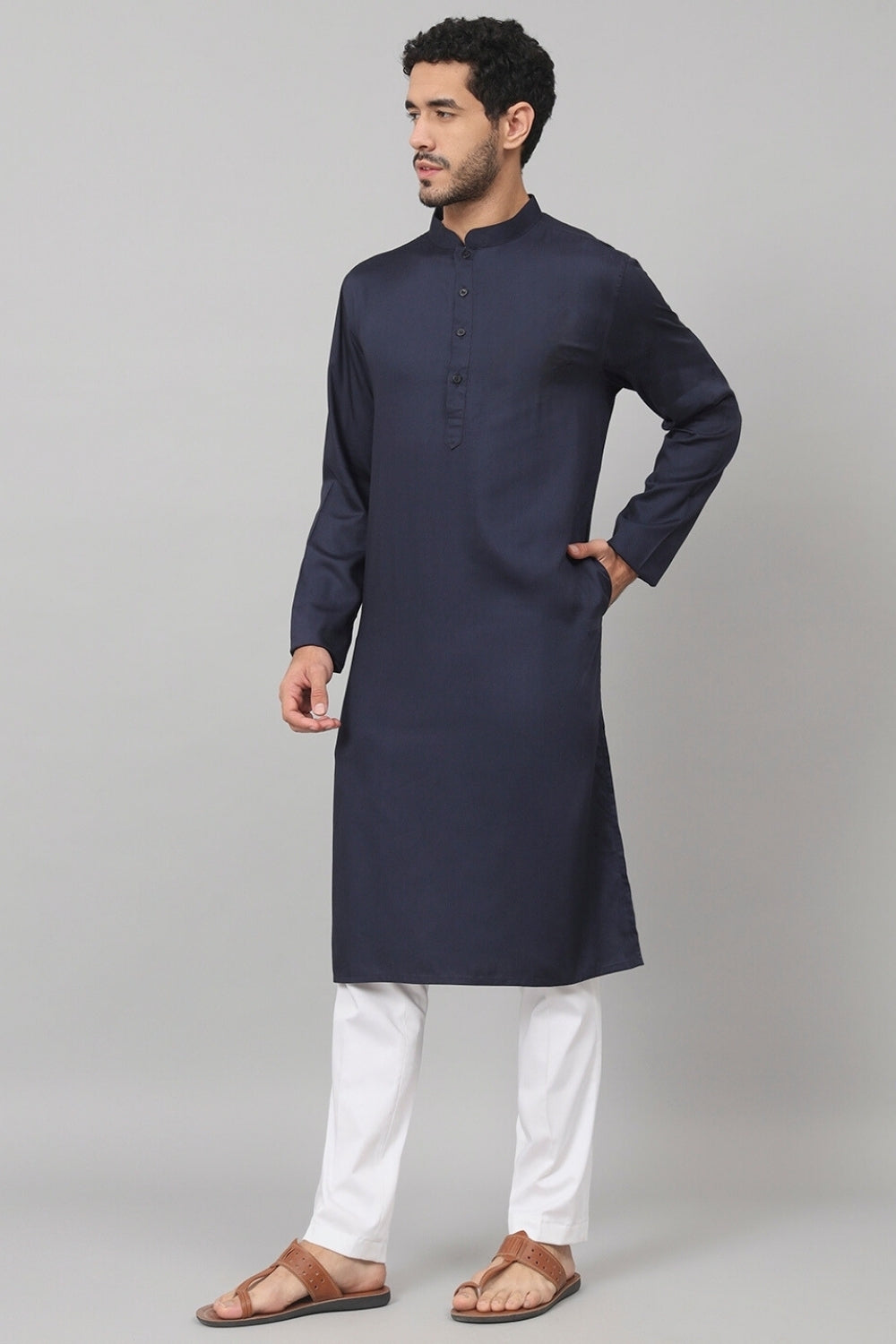Giza Cotton Navy Blue Plain Kurta by Hilo Design - Distacart
