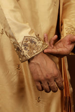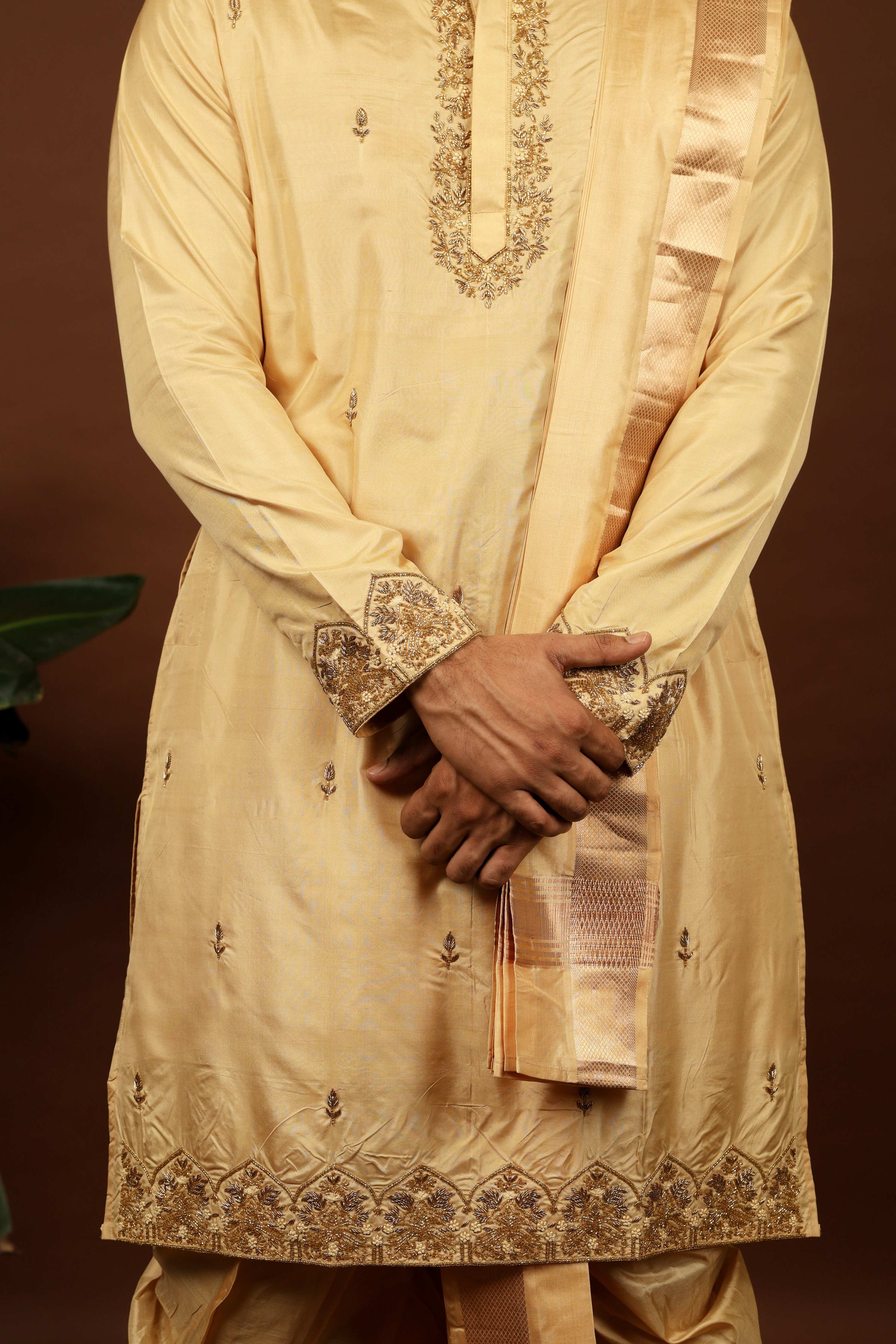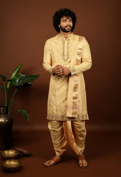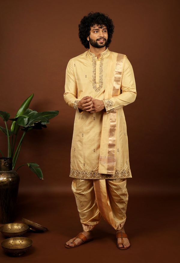 Enhance your allure with the Pattu kurta set. A rose gold kurta crafted from pure silk is paired with a dhoti featuring a lavish gold. Intricate cutdana and zari hand embroidered detailing at the neckline, cuffs, and bottom hemline , embellished with elaborate gold work and all-over Buta, exudes exquisite charm.