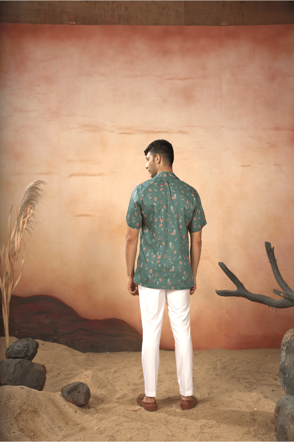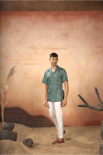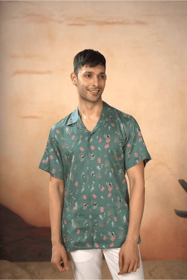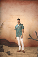 Oceanic Mirage Shirt by Hilo DesignImmerse yourself in the tranquility with this Oceanic Mirage Nehru Jacket. The serene sea-green backdrop, adorne...