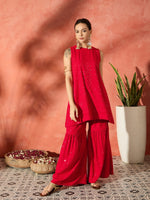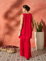 InWeave Red Chikankari Short Kurta SetThis stunning red sleeveless Chikankari short kurta sharara set features exquisite hand-embroidered details t...