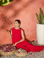 This stunning red sleeveless Chikankari short kurta sharara set features exquisite hand-embroidered details that add a touch of elegance. The airy silhouette ensures comfort and style, making it perfect for summer gatherings or festive occasions.