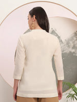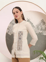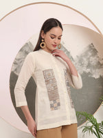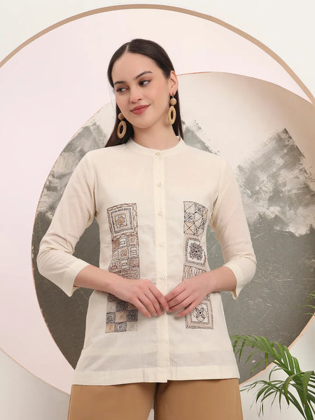 Yufta White Pure Cotton Top With Embroidery Product Details  White regular shirt style top Solid embroidered Mandarin collar, three-quarter, regu...
